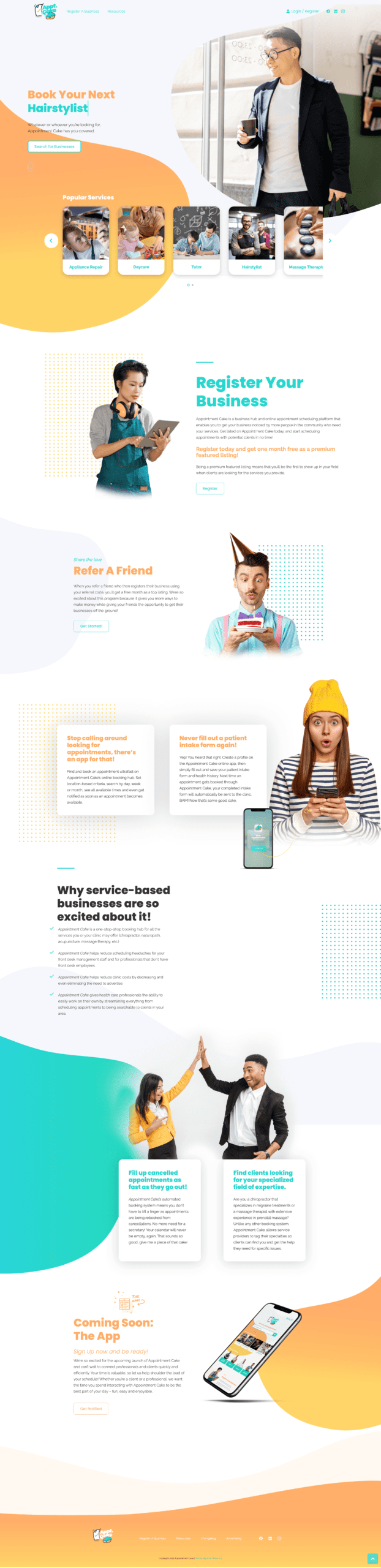 Vigilante Marketing’s developer Peter Vigilante built a fully responsive, mobile-friendly landing page based on Tina Dee’s design that clearly communicated what Appointment Cake does and why it’s different than other booking hubs.