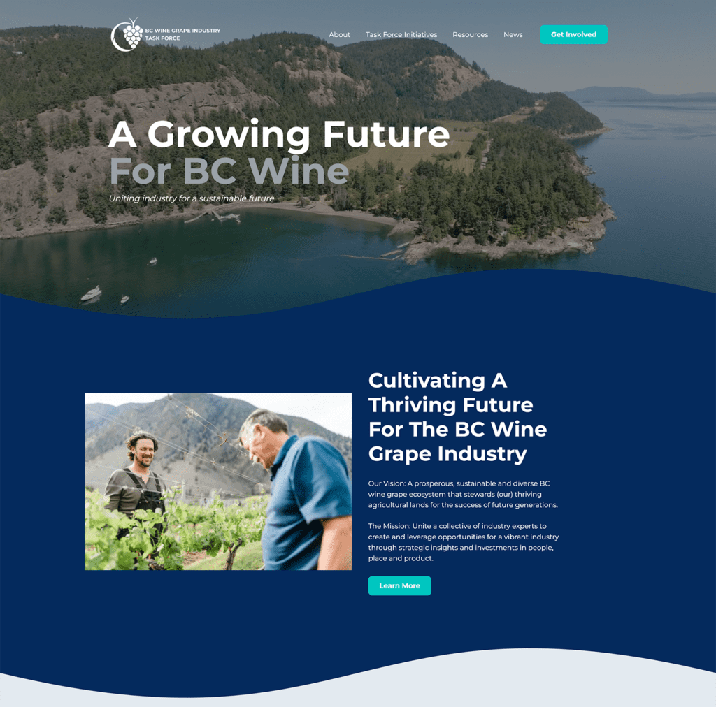 We developed an informative and user-friendly website for the BC Wine Grape Industry Task Force that aligns with their mission of fostering a thriving wine grape industry. The website features comprehensive sections on current research initiatives, educational opportunities, and industry news. It includes resources such as best practices guides, sustainability programs, and detailed reports on market assessments and replanting guidelines. The site is designed to engage industry stakeholders by providing easy access to essential information and updates, enhancing the Task Force’s role as a key resource and advocate for the British Columbia wine grape community.
