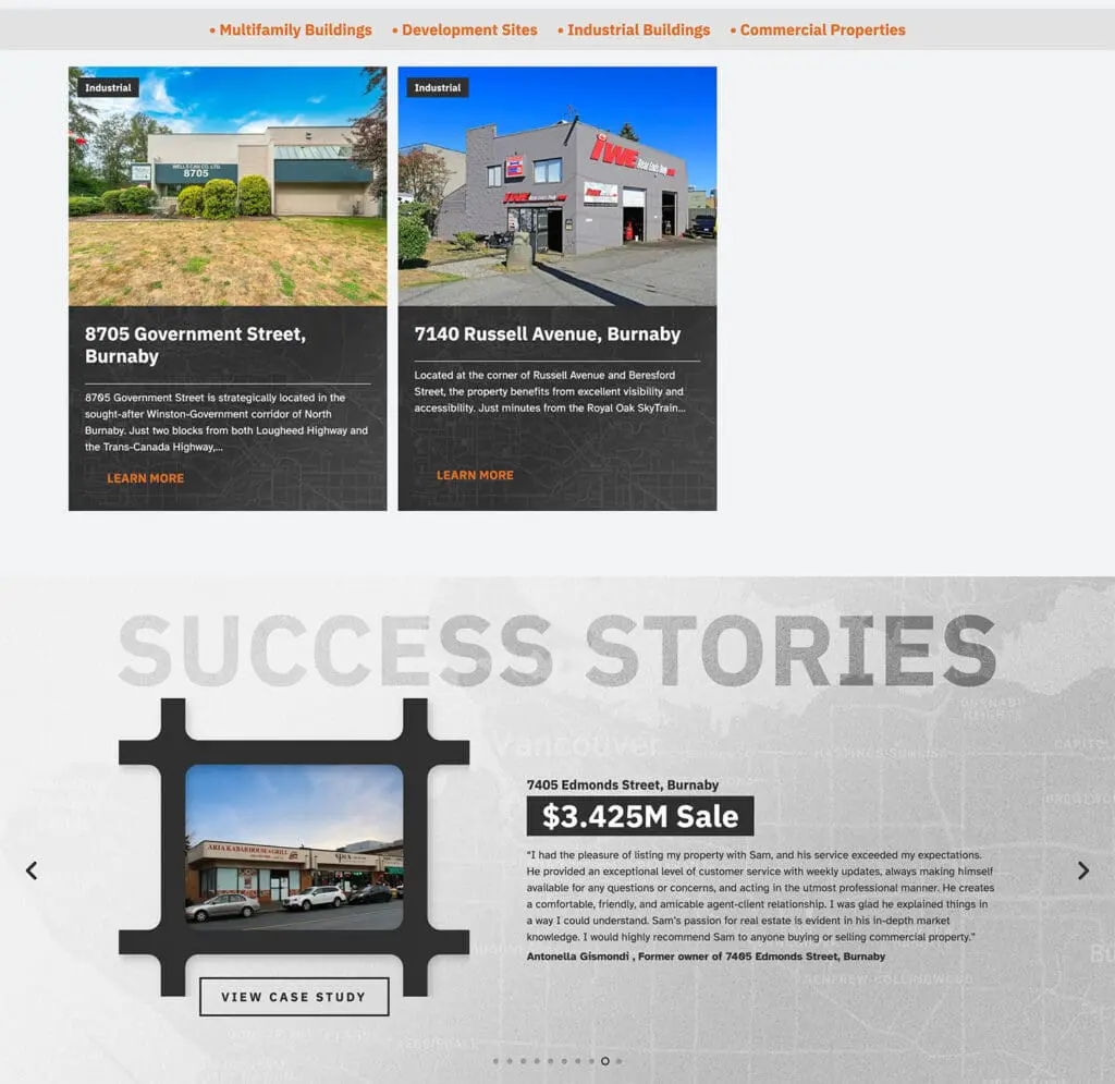 Modern website structure showcasing services and commercial listings