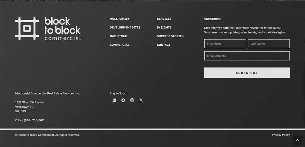We developed a complete brand identity for Block to Block Commercial, creating a clean and confident visual system designed to reflect the structured, strategic nature of commercial real estate. The brand identity informed the design and development of their website, which was built to highlight services, commercial listings, and industry expertise in a clear and accessible way. The website balances professional credibility with modern design, guiding visitors through the company’s services while encouraging inquiries from potential clients and investors.