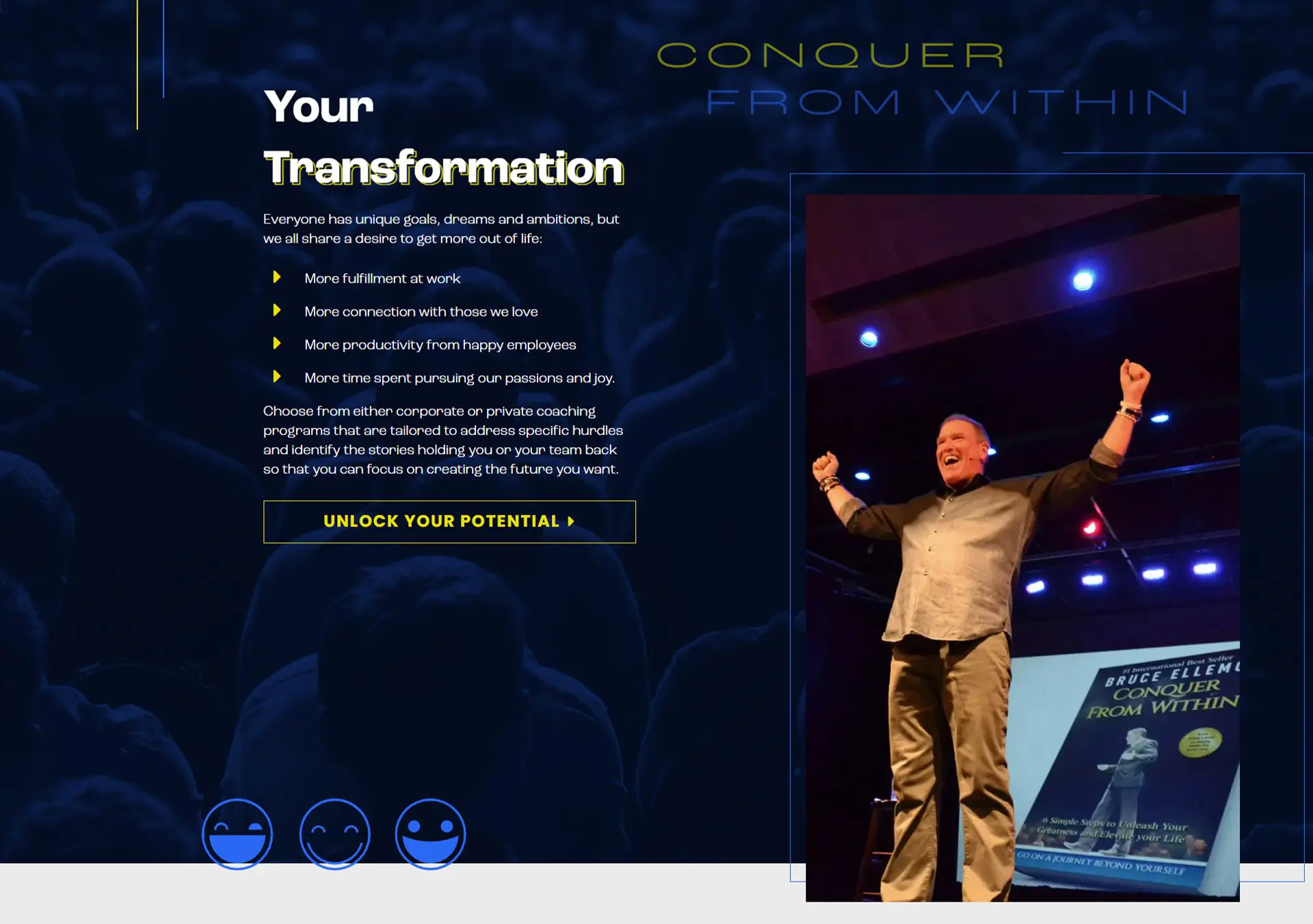 Our resident designer, Tina Raposo, began her design process by creating a bold and modern logo that incorporates a smiley face emblem to represent the positive, glass-half-full emotion of the brand. Her overall website design used broken grid layouts to emulate a feeling of pushing oneself outside their boundaries/comfort zone. Additionally, a darker color scheme was utilized to convey the impression of a stage in a dimly lit hall. Finally, intense electric blues and radical yellows were applied to emphasize a spotlight motif to highlight Bruce being in his element.