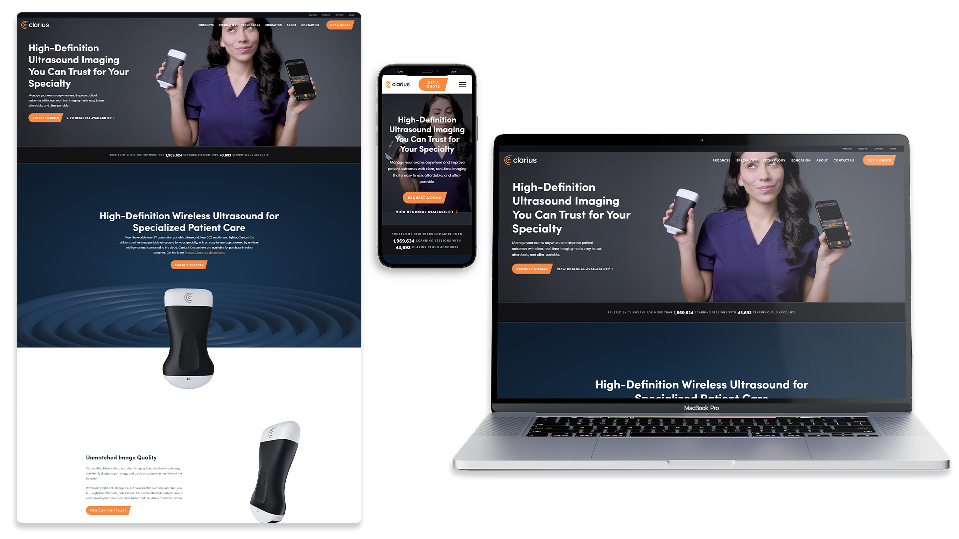 To begin the Clarius project, a VM designer, Tina, created an initial design concept used as a baseline by another design agency previously contracted by the client to encapsulate the overall brand and necessary functionality. The other agency utilized some of Tina’s graphical styles and brand elements in this design partnership.