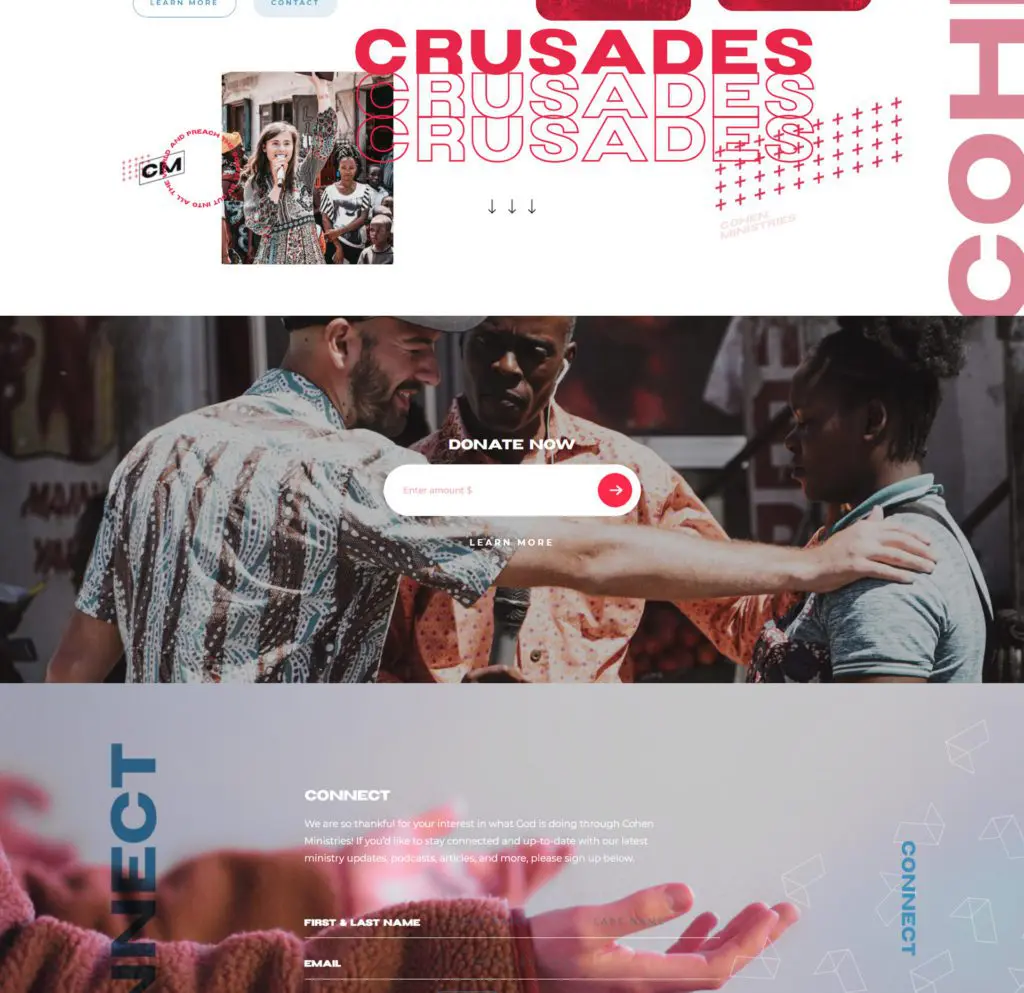 Tina Dee, from Brandzuzu, designed the site using dynamic, contemporary shapes and colors to appeal to the younger audiences looking to be inspired by the Cohen’s crusades. She developed the Cohen Ministries brand in conjunction with the website creating a geometric motif throughout to represent the opening of a gospel book.