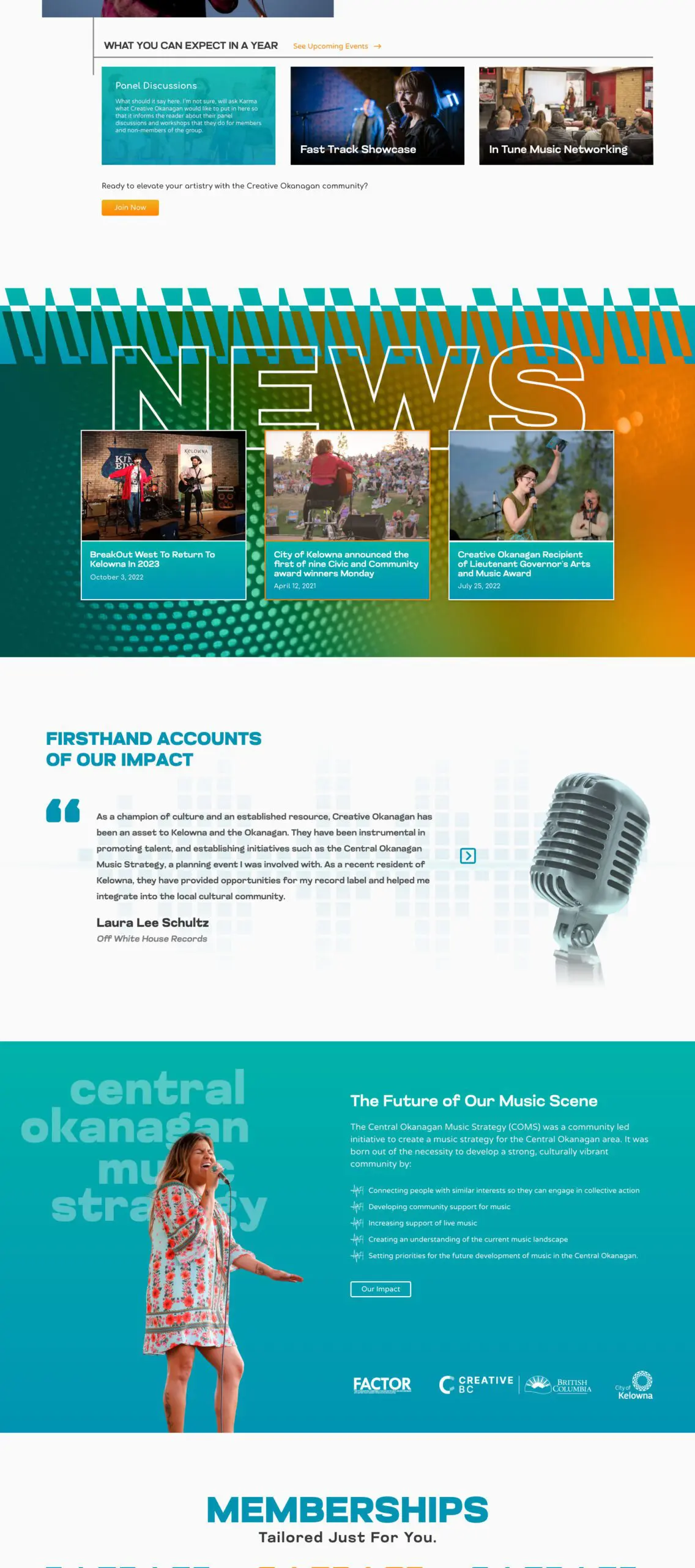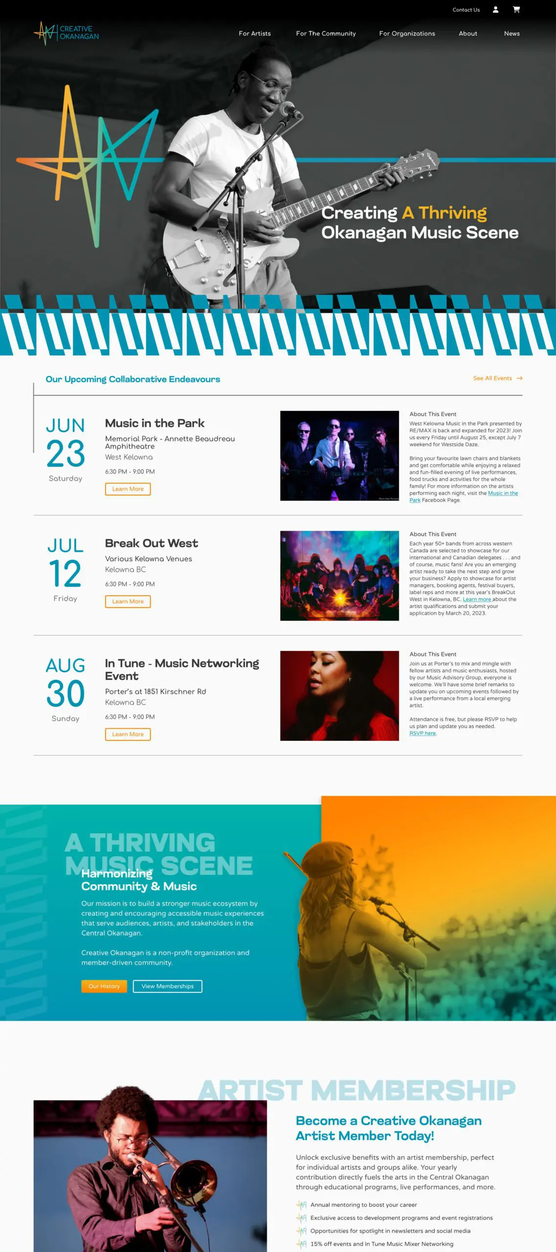 - Events Platform: A dedicated section was created to highlight the various concerts and musical events that Creative Okanagan plays a role in organizing, providing a dynamic showcase of local talent.