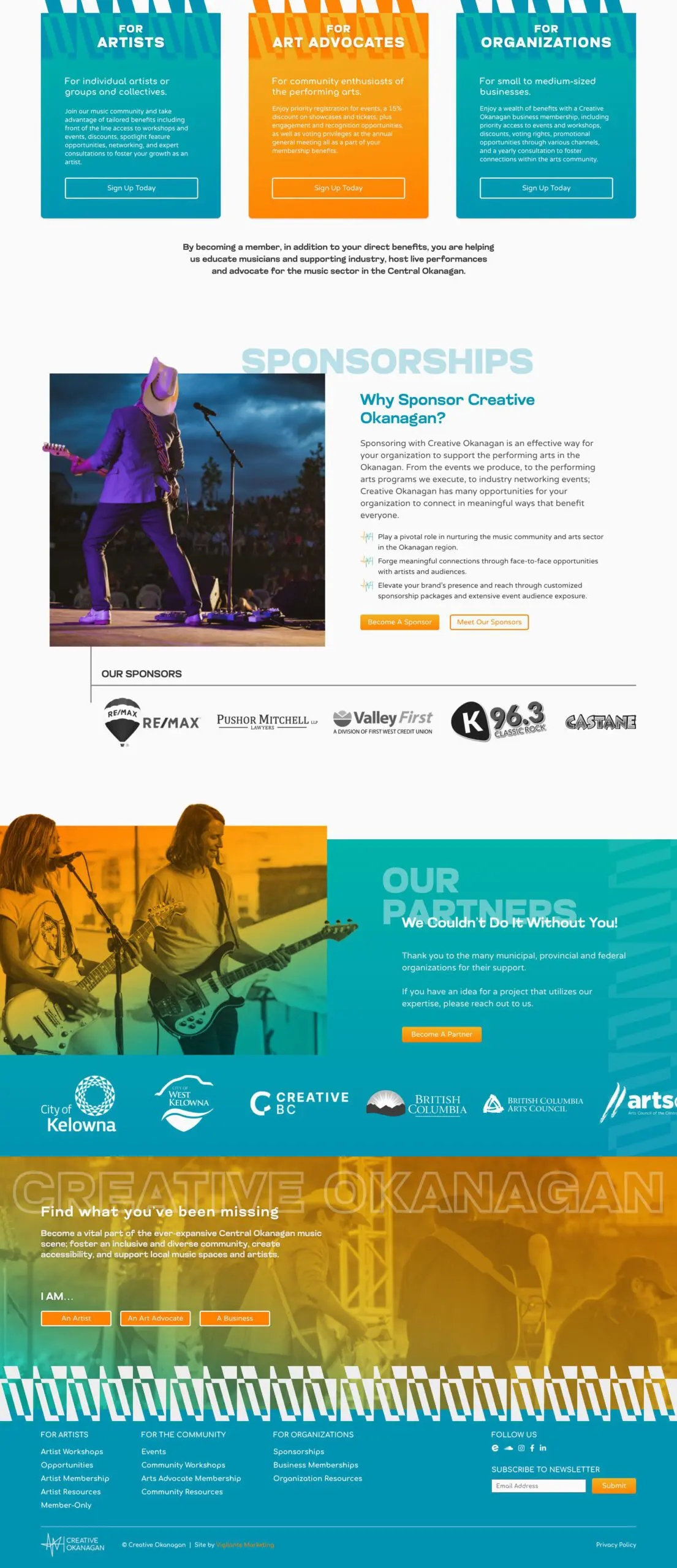 Creative Okanagan approached us with the need for a revitalized online presence that could more effectively broadcast their events, announcements, and the comprehensive data they had amassed on music venues throughout the Okanagan. Their goal was to provide a valuable resource for musical acts seeking booking opportunities. The organization sought an updated, modern website design that mirrored the fun, artistic essence of their work. Additionally, they needed to rectify issues with their previous website, which suffered from broken functionalities such as non-operational forms and a missing footer. Moreover, Creative Okanagan was keen on enhancing their membership service, enabling artists and community supporters to foster stronger connections and access exclusive content.