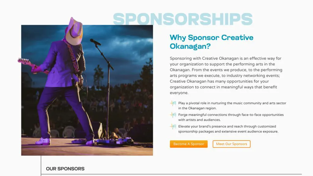 Through these enhancements, the new website not only resolves the previous site’s technical issues but also offers a platform that truly represents Creative Okanagan’s mission and vision. The improved site functionality, coupled with a modern, engaging design, provides Creative Okanagan with a powerful tool to promote their events, showcase local talent, and support their business partners and sponsors, paving the way for increased revenue and further growth of the Central Okanagan’s music scene.