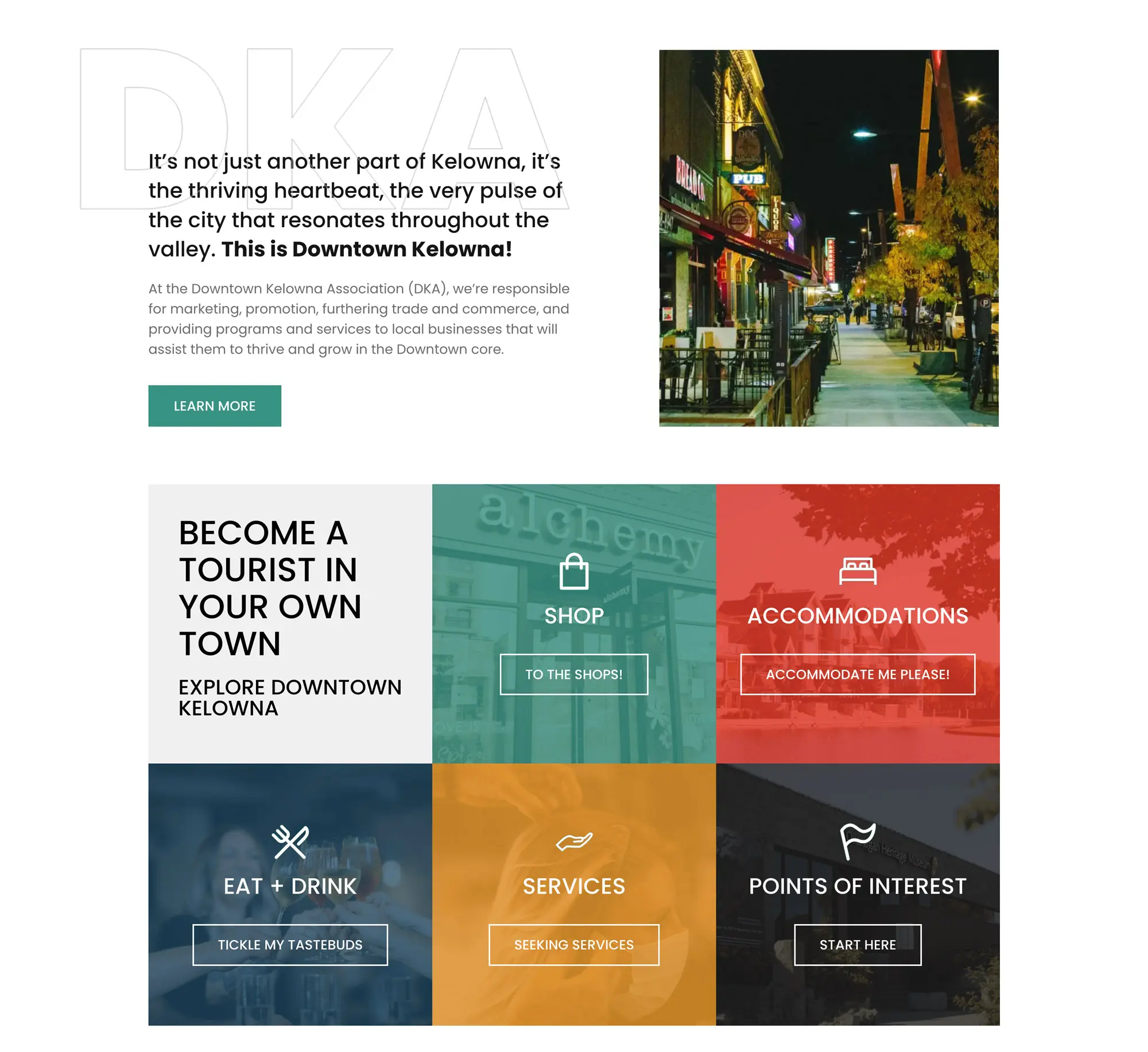 A modern, high-impact website that strengthens DKA’s role as a central connector for the community — helping businesses thrive and making it easy for people to discover the best of Downtown Kelowna