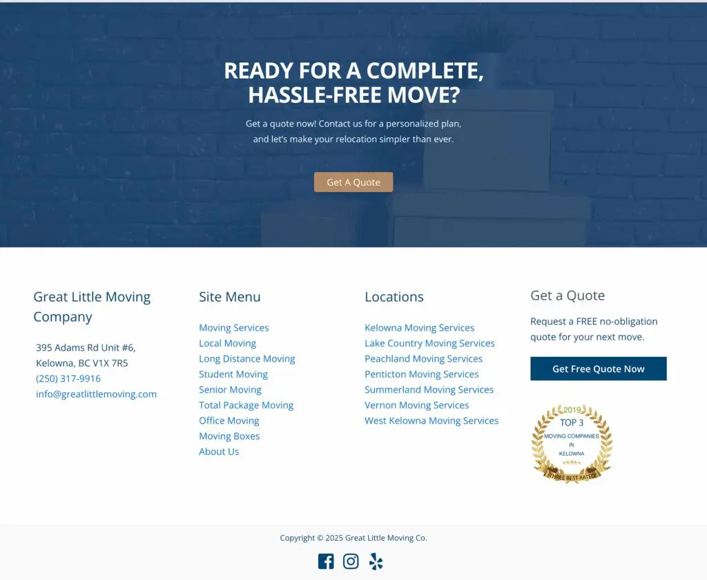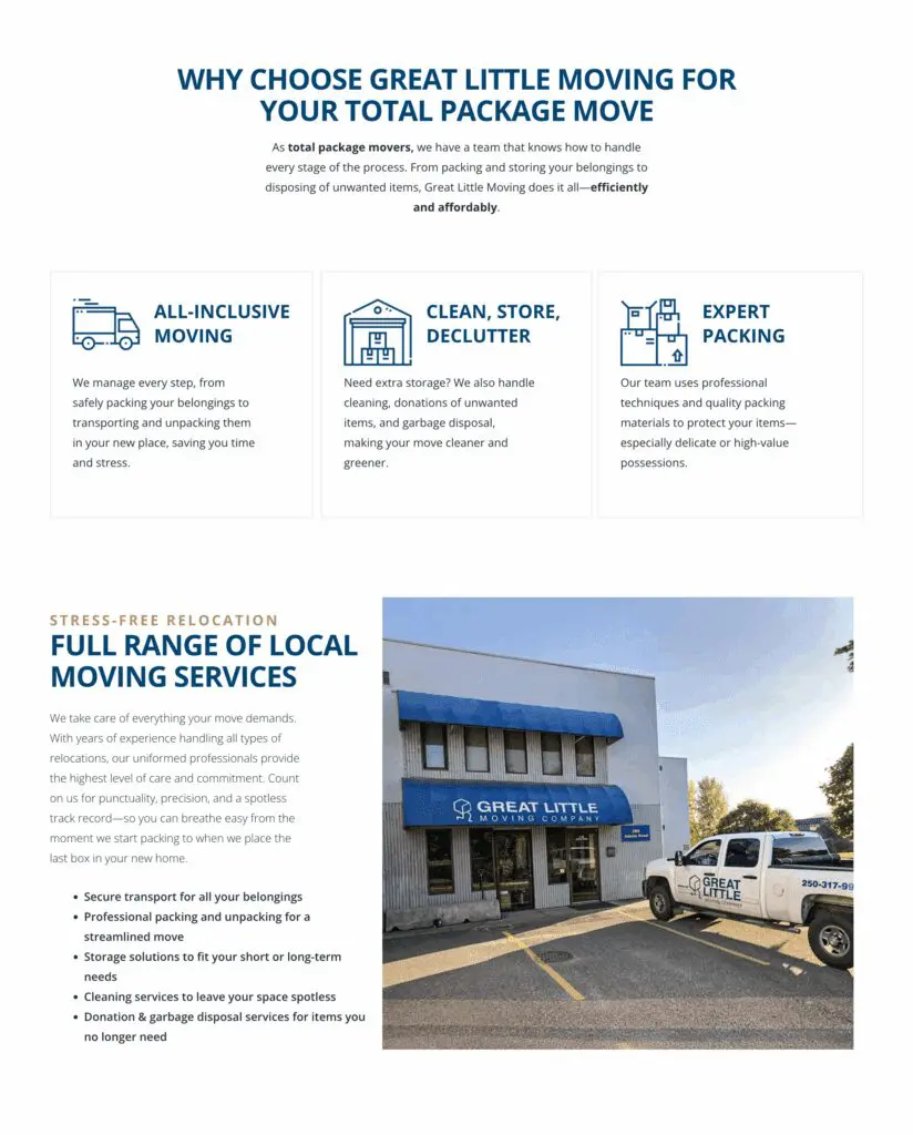Great Little Moving needed a suite of SEO-optimized landing pages to support their service expansion. They wanted dedicated pages for each service type—local moves, long-distance, commercial, packing, and specialty jobs—plus geo-targeted pages tailored to each of their operating locations. The aim was to improve search visibility, attract local customers, and make it effortless for users to find the right moving solution in their area.