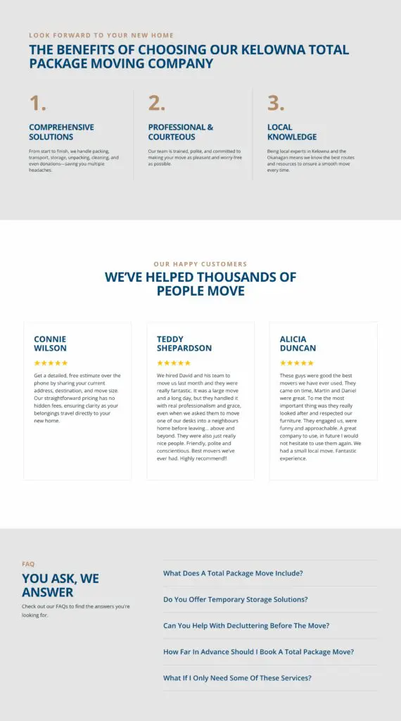 We designed and developed a comprehensive network of landing pages across both services and locations. Each page follows a clear structure: a service overview with key benefits (“stress‑free local moves”, “professional packing assistance”), relevant customer testimonials, transparent pricing or estimates guidance, and strong calls to action to request a quote or book online. For location-specific pages, we integrated local keywords, service area landmarks, and tailored messaging to improve SEO relevance and resonate with each community. The result is a well‑structured, conversion‑focused web presence that enhances search performance, clearly communicates service offerings, and drives qualified leads across all of Great Little Moving’s markets.