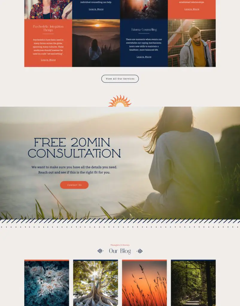 The website was designed to be simple and user-friendly, with plenty of opportunities for users to book an appointment using the fully integrated existing jane app. The photography incorporated sunlight and outdoor settings to convey the bright moments and epiphanies that can result from good counselling sessions.