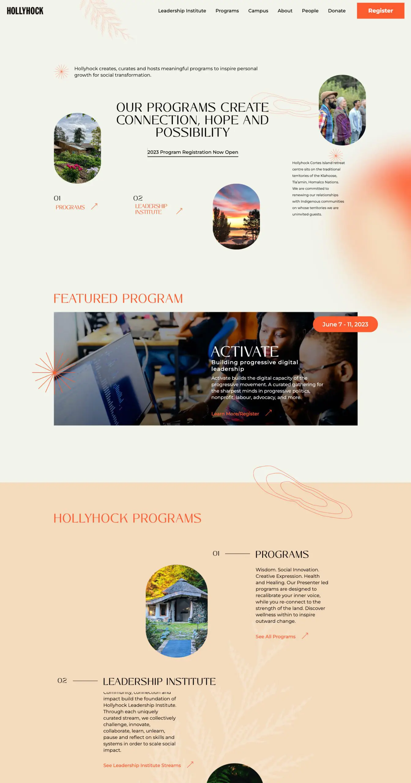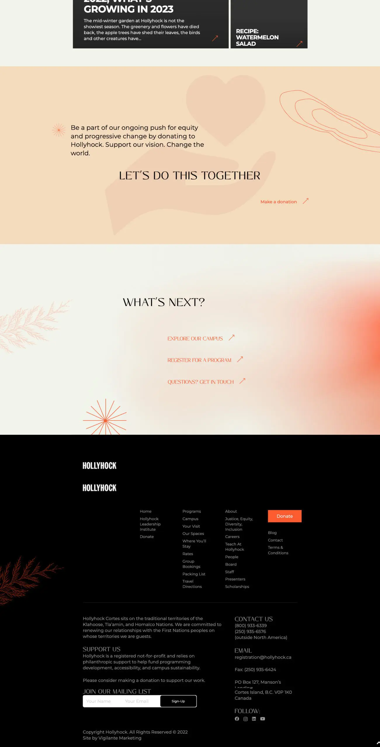 Vigilante Marketing was the lead web development agency for Holly Hock’s website redesign project in partnership with Emily Chow Marketing (ECM). Our team was responsible for building the visually stunning website design created by ECM’s in-house designers in collaboration with Brandzuzu. We used cutting-edge development techniques to bring the unique and personalized design elements inspired by the rugged landscape of Holly Hock’s Cortes Island campus to life.