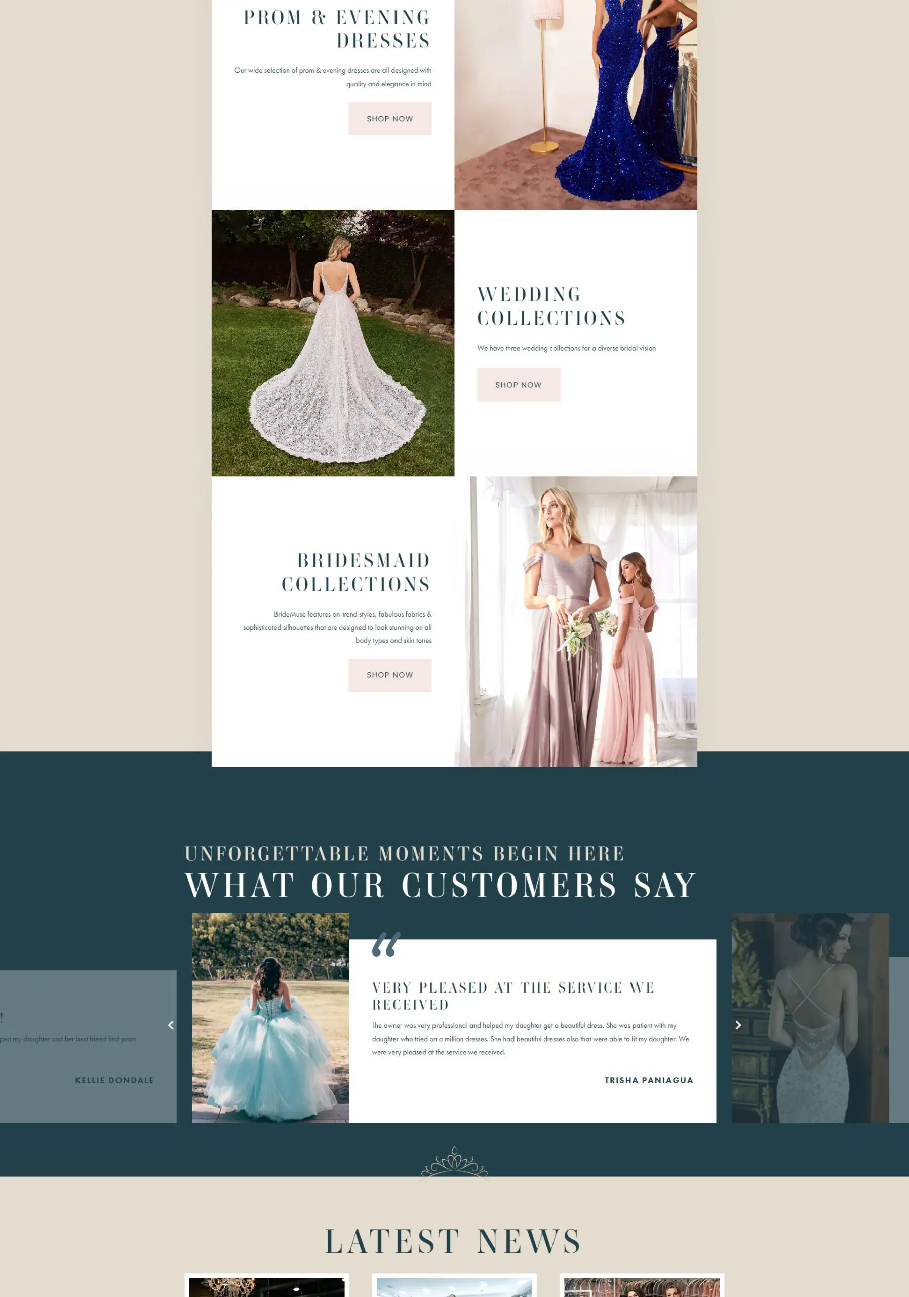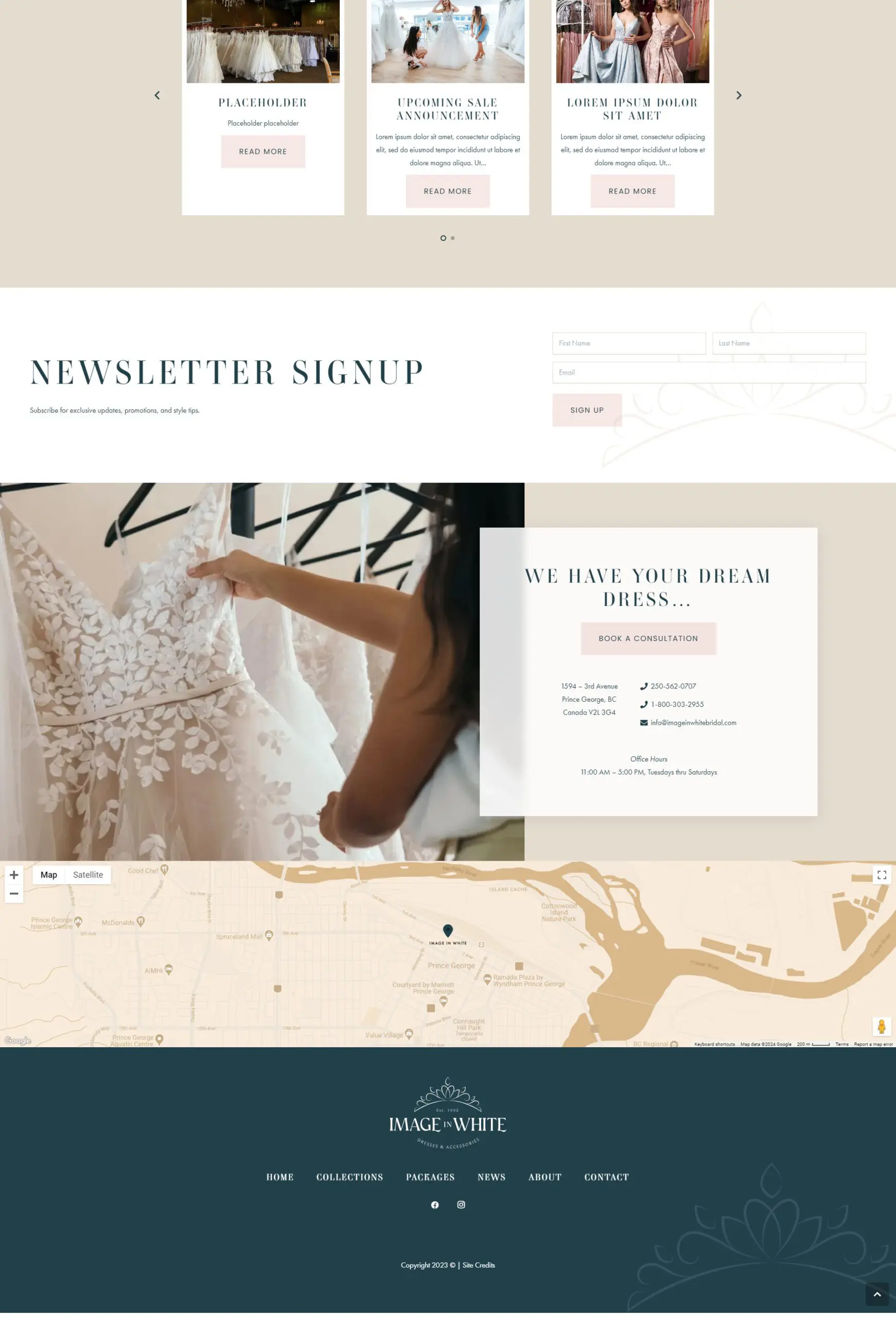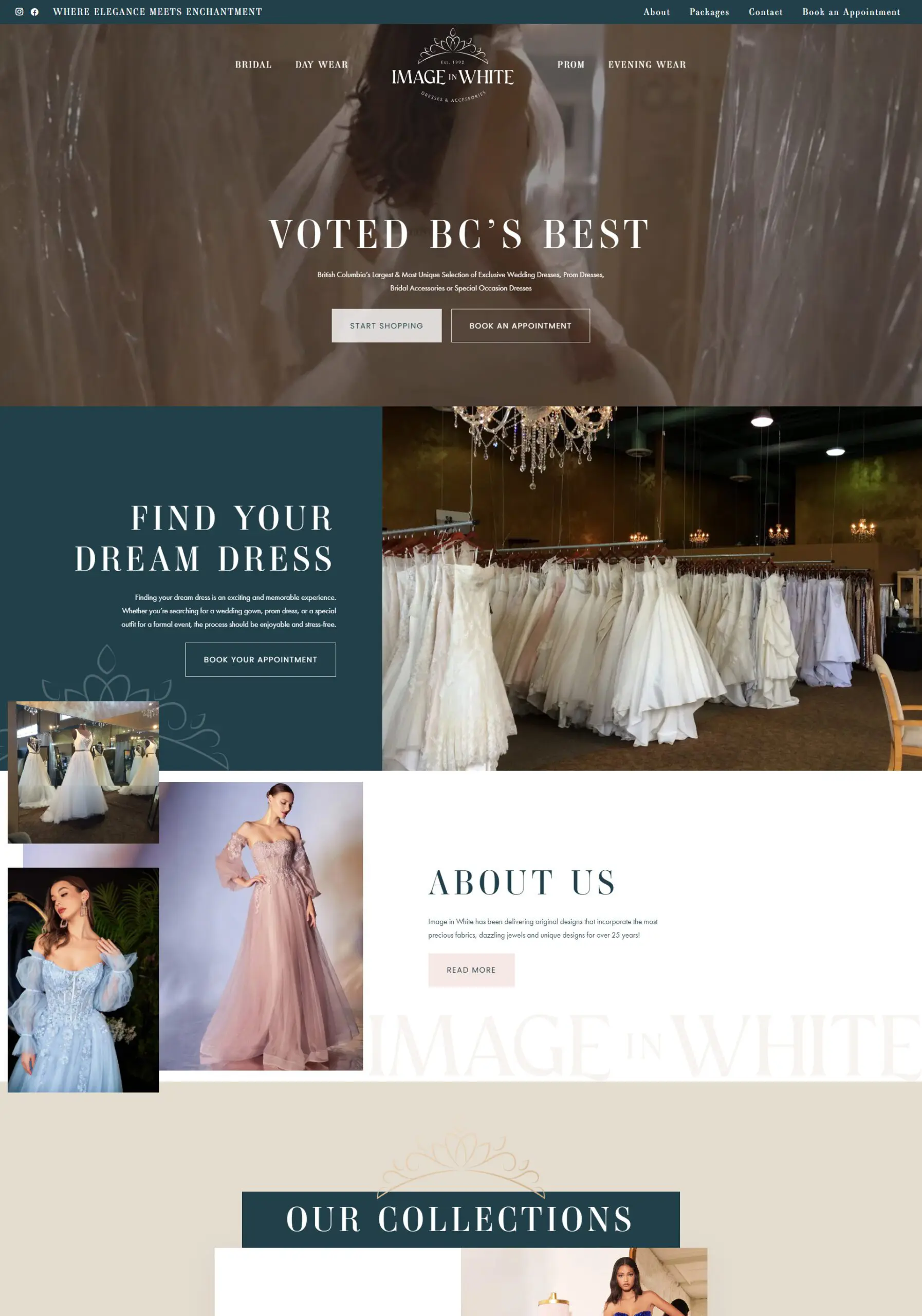 In response to “Image In While’s” vision, we crafted a logo that perfectly balances luxury with accessibility. The logo features a vintage-style layout combined with an elegant, luxurious font, and a symbol mark depicting a light, flowing crown adorned with subtle floral or leaf shapes. This design choice reflects the high-end, yet inviting, ethos of the brand, ensuring it stands out, especially for outdoor signage. Transitioning this elegance to the digital realm, we developed a website that aligns with the client’s preference for modern, minimalist aesthetics. By incorporating the client’s selected color palette, we designed a bold, eye-catching banner through a meticulously edited short video of bridal and prom footage. This feature not only captures the visitor’s attention but also vividly showcases the unique offerings of “Image In While”. The use of a clean, airy serif font on the website complements the logo’s font, creating a seamless visual narrative that enhances the brand’s online presence, making it both inviting and reflective of their unparalleled elegance and timeless designs.