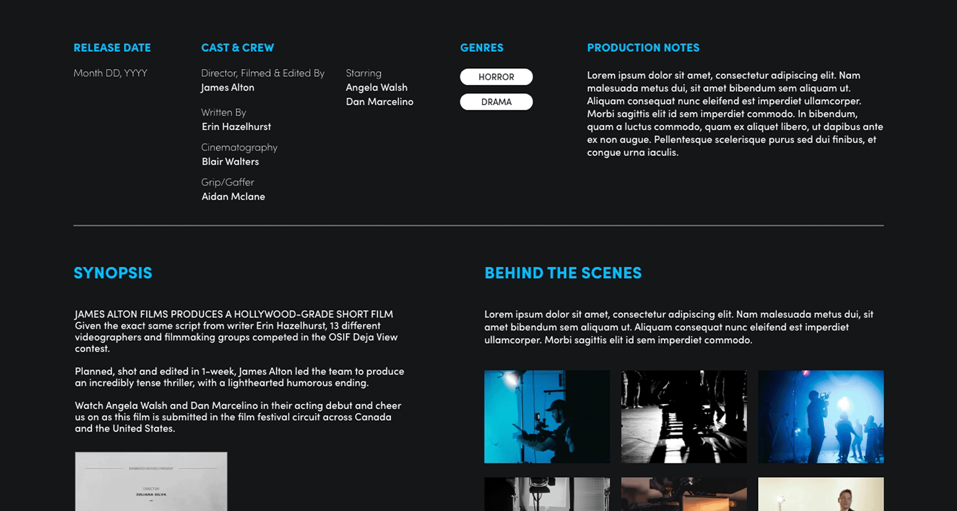 As well as being the lead designer on this project, David was the primary developer. He built a standardized portfolio page for each video which James & his team could easily use to neatly organize the cast & crew, genres, production notes, synopsis, and behind the features information for each project. David also developed a black and white tile layout to get users interested in viewing other videos on the site – with the individual tiles becoming coloured and playing a short video clip once hovered over.
