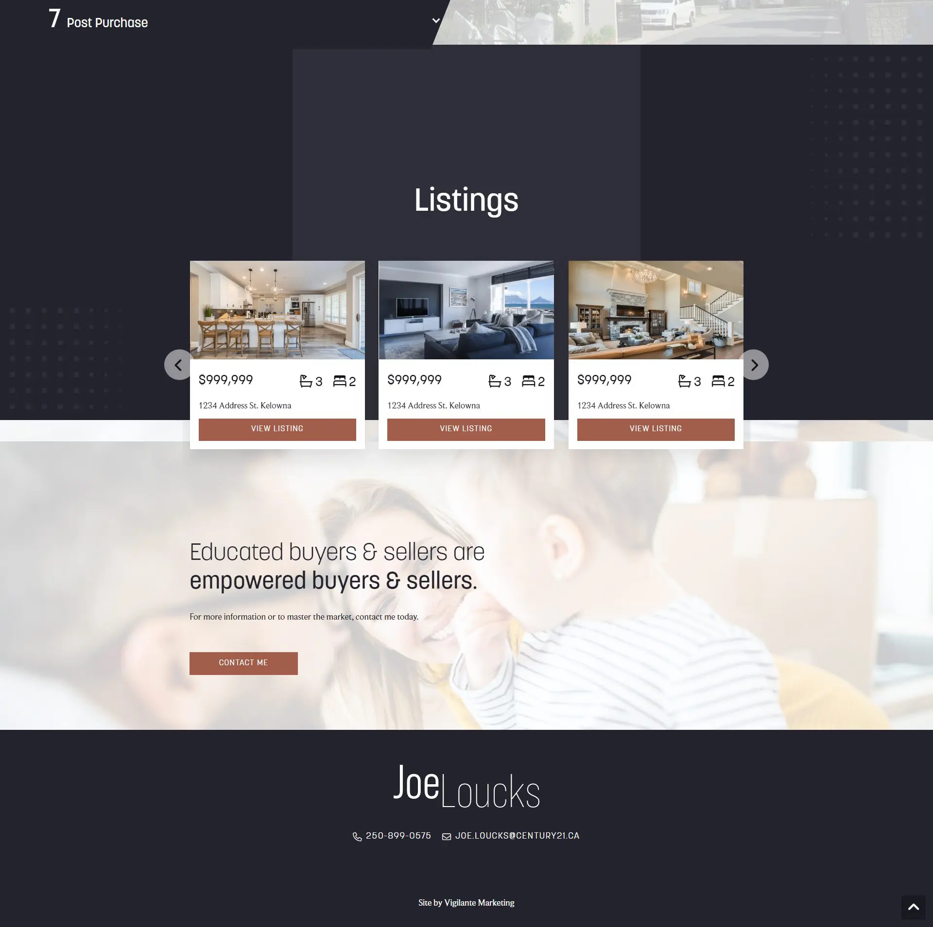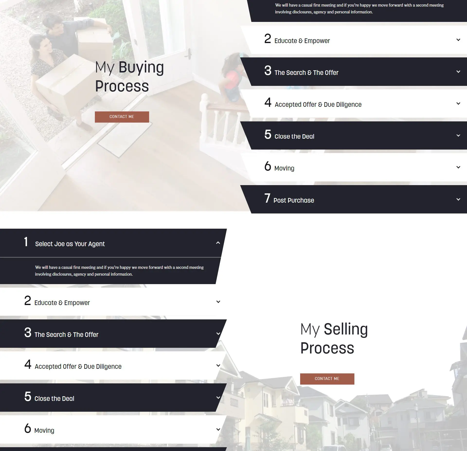 Tina also designed an infographic on the buying + selling process so that clients have a clear + honest picture of what they can expect when working with Joe Loucks. They need to understand precisely how Joe operates so they can make informed decisions about their purchases or sales. On the development side, Tina built the backend to be simple for Joe to use with custom post types that allow him to add and remove listings easily. In addition, the buying and selling sections were uniquely styled using CSS to add a fun way for clients to interact with Joe’s processes.