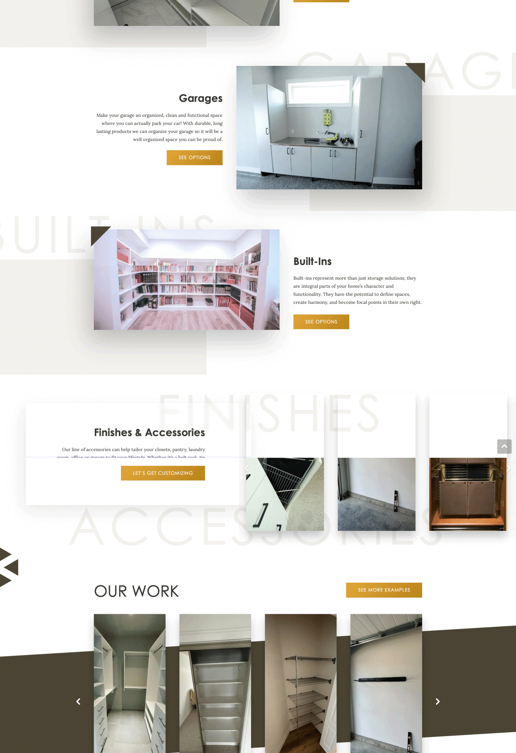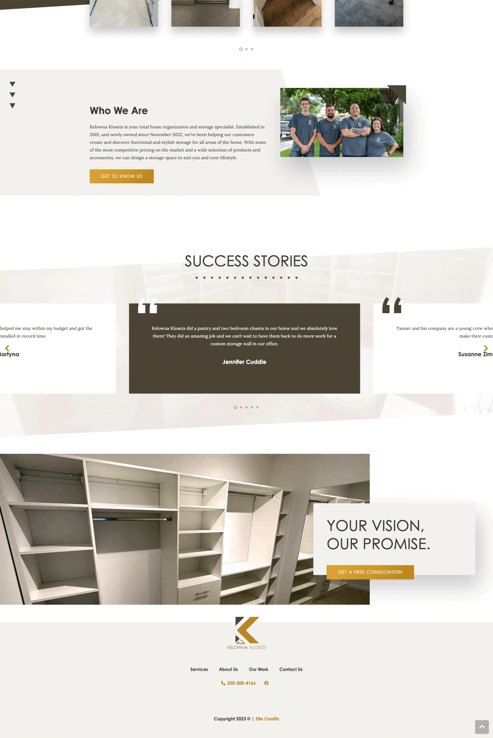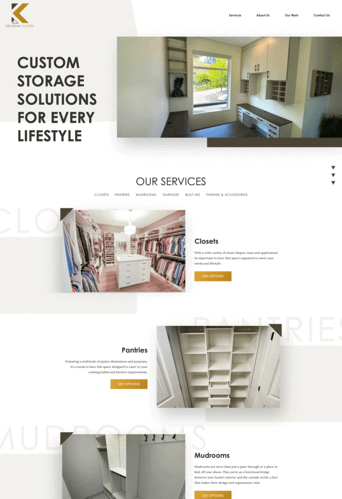 Tina, our talented designer, took the helm of this project, internalizing Kelowna Klosets’ aspirations. She crafted a design that highlighted a fresh, airy feel with predominant white backgrounds. Using typographic techniques, Tina added layers of depth to the site, making sure to embed key brand motifs, including the repeating triangle elements and geometric shapes drawn from their logo.