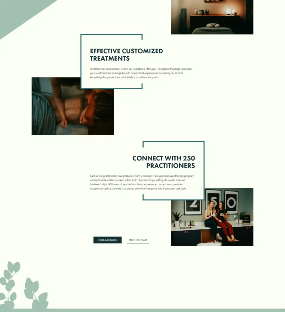 The Vigilante Marketing team visited the Massage 250 studio, took a tour to understand the look and feel of the brand, and discussed with Brittany the direction she hoped her updated online presence would take. From this visit, our designer, Tina Raposo, created a design concept that encapsulated the studio brand imagery. She utilized geometric shapes and masculine greens and blues with soft tones to contrast and appeal to all genders.