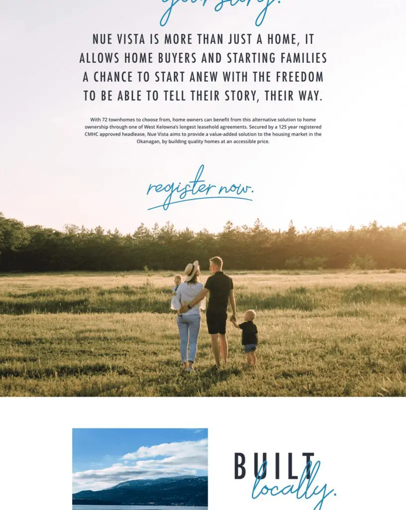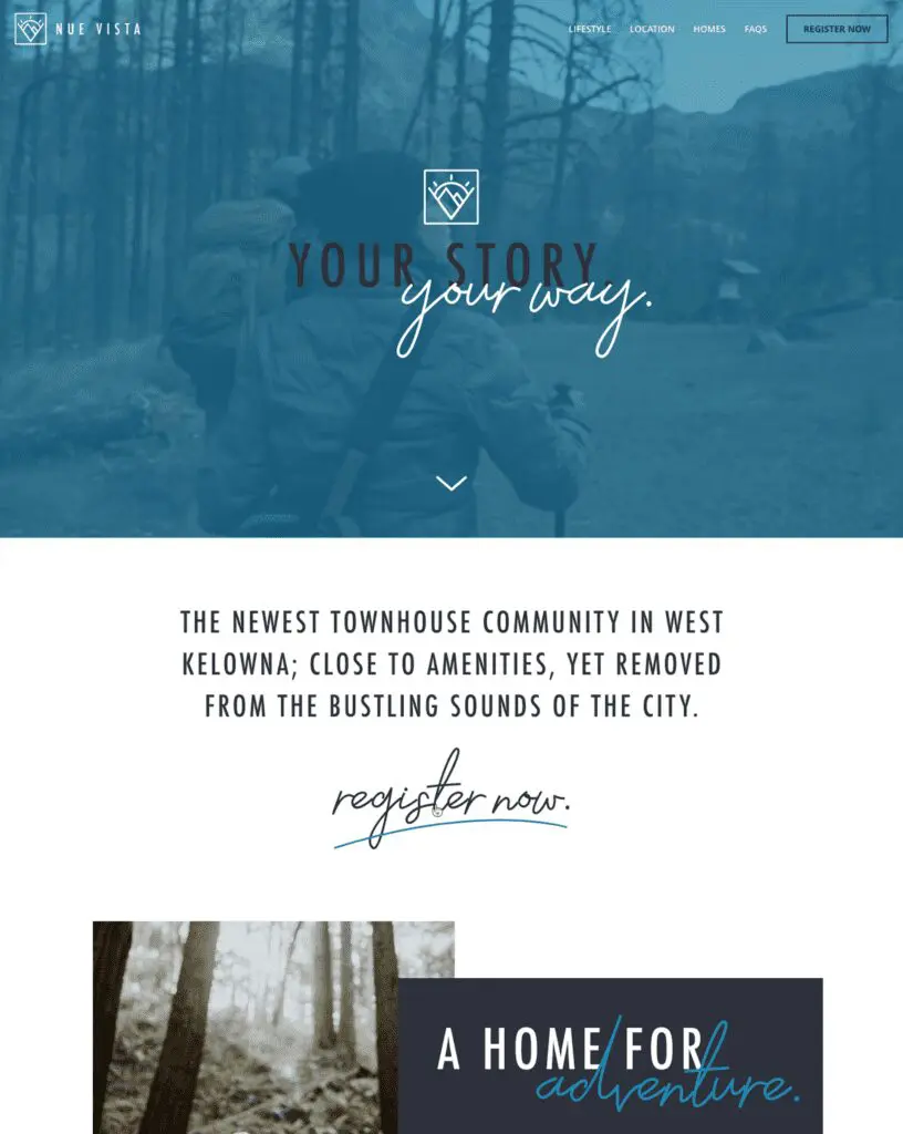 We developed a brand identity for Nue Vista that captures the essence of adventure and activity, which is central to their developments. The logo we designed is clean and modern, using a minimalist approach to convey simplicity and functionality. The accompanying brand visuals depict high-energy activities like mountain biking, underlining the active lifestyle that Nue Vista promotes. These images are coupled with empowering taglines such as “Your story, your way,” highlighting the personal and active experience that residents can expect.