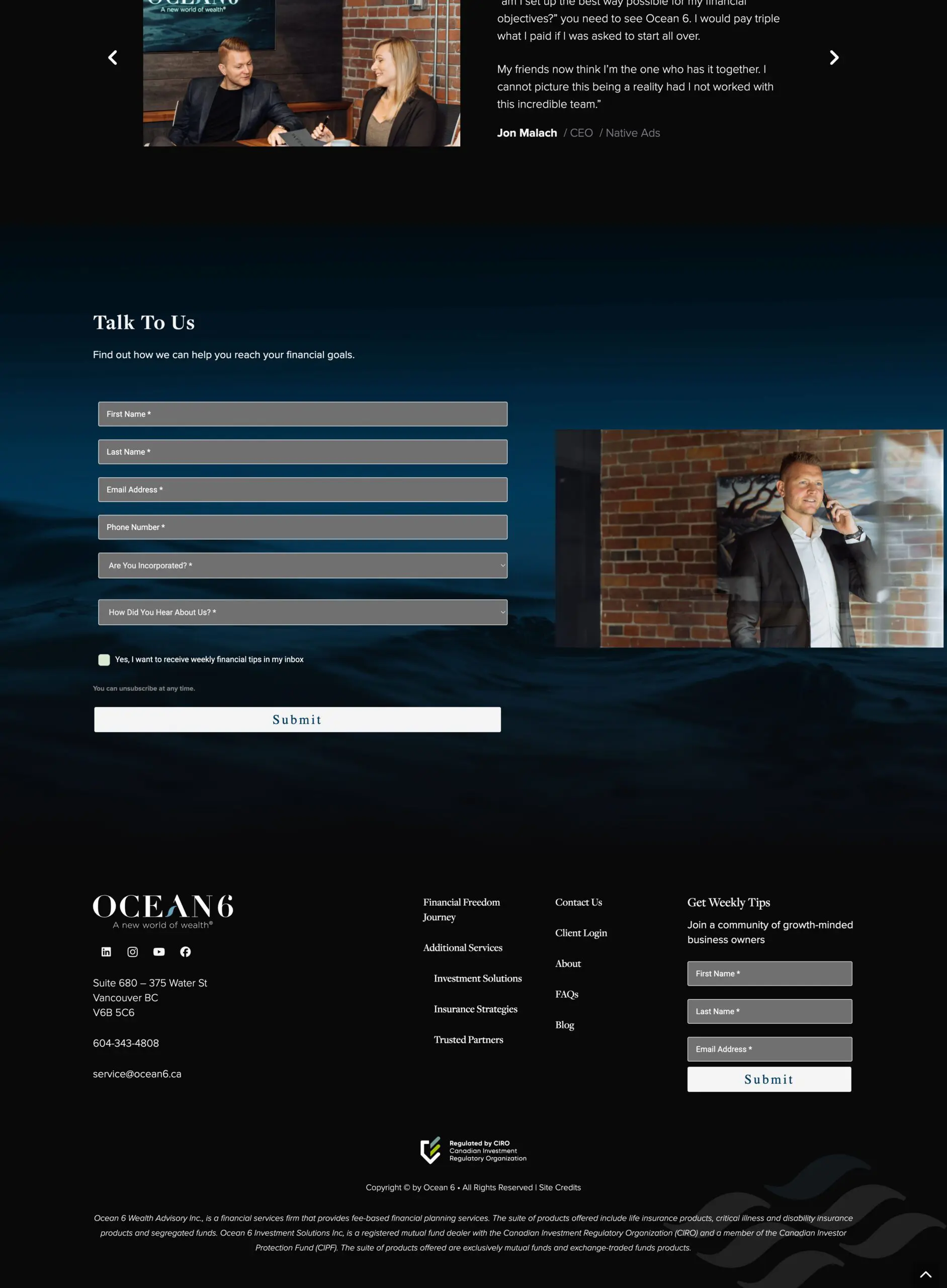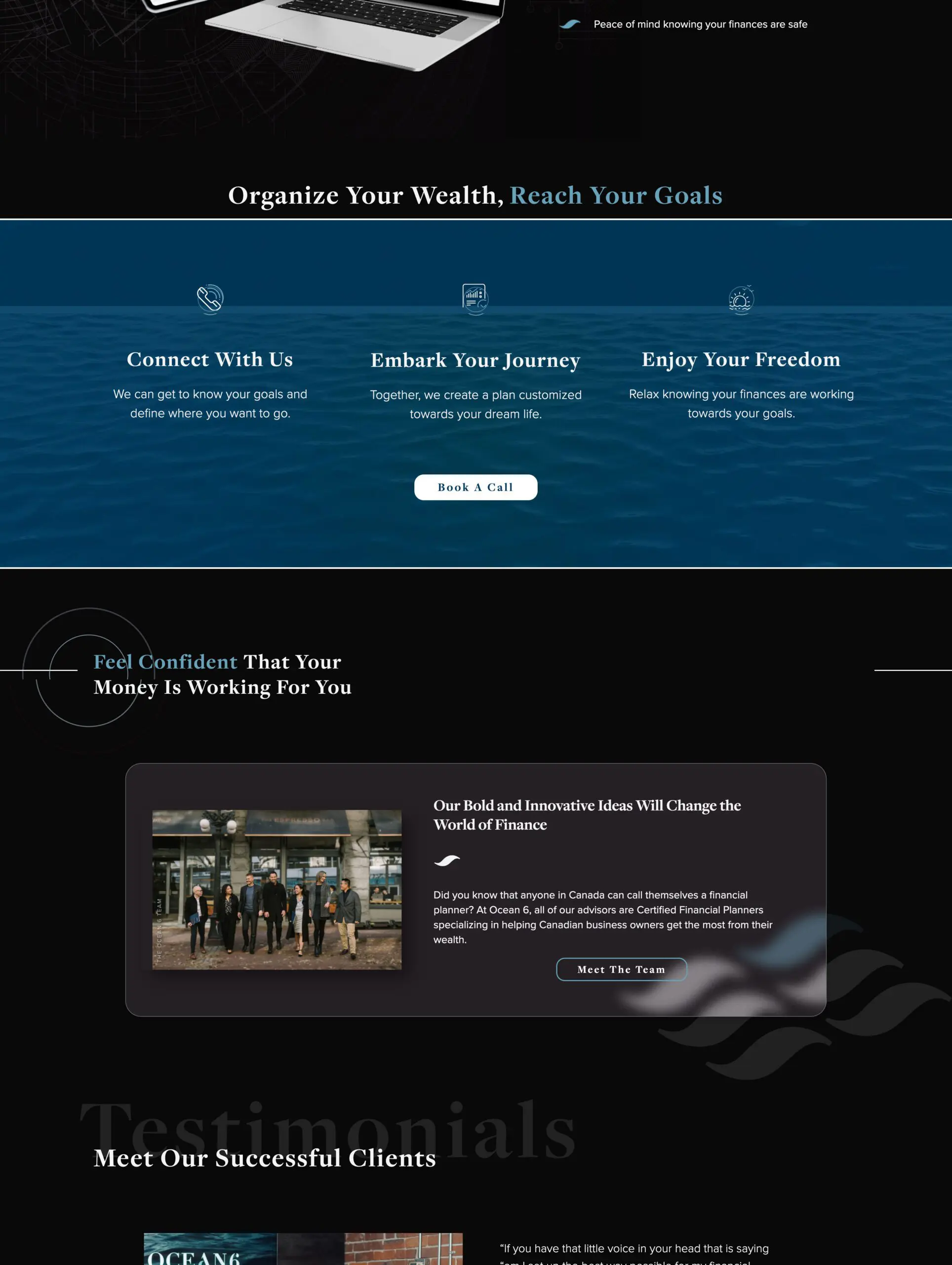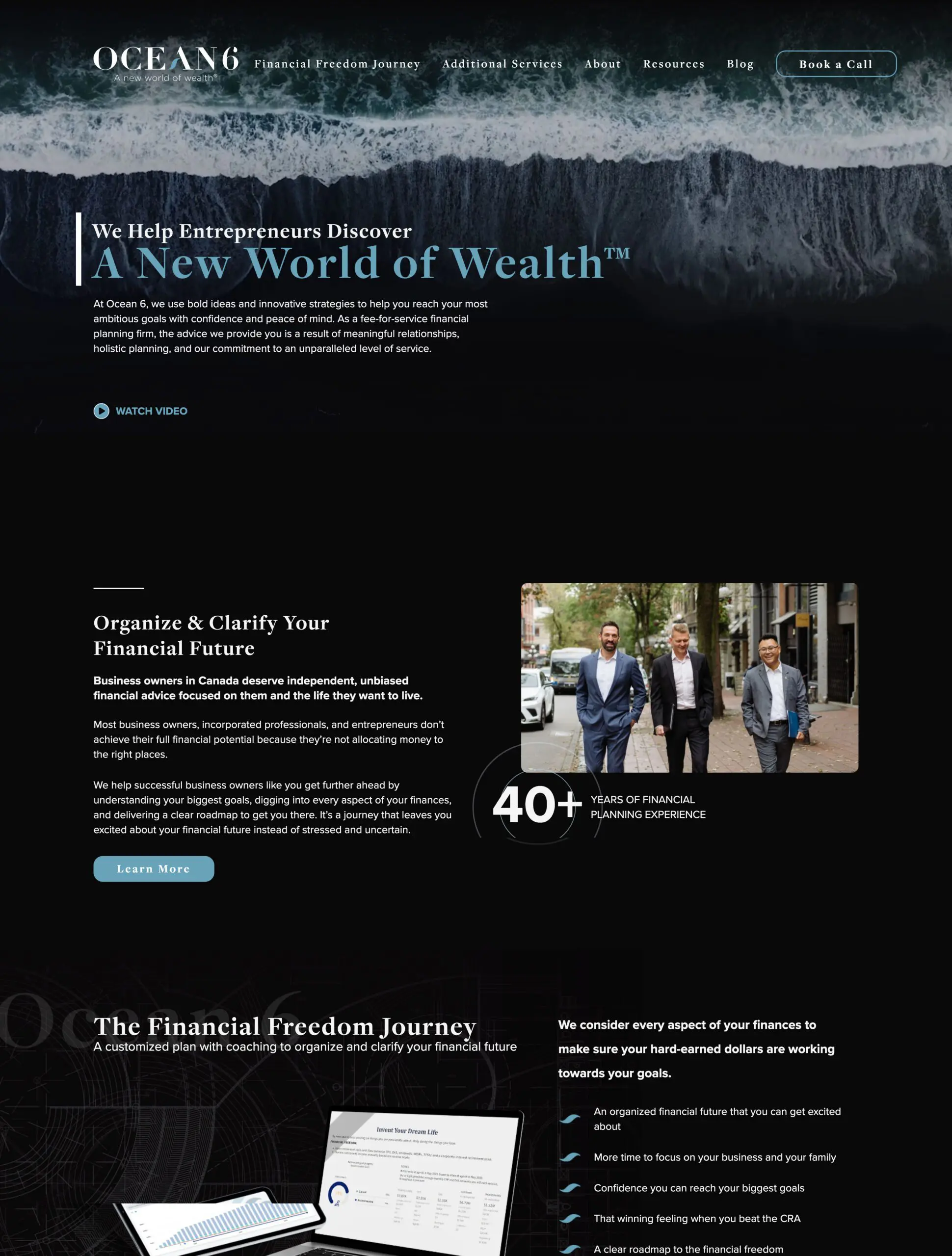 When Ocean 6 approached us, their vision was clear: they wanted a website that not only communicated their high-end, exclusive financial services but also resonated with the WOW factor they embody. Their requirement was not just a digital presence, but an online platform that mirrored the sophistication and exclusivity of their wealth advisory services. They needed a website that spoke directly to the discerning Canadian business owner, showcasing the unparalleled expertise and bespoke financial solutions that Ocean 6 offers.