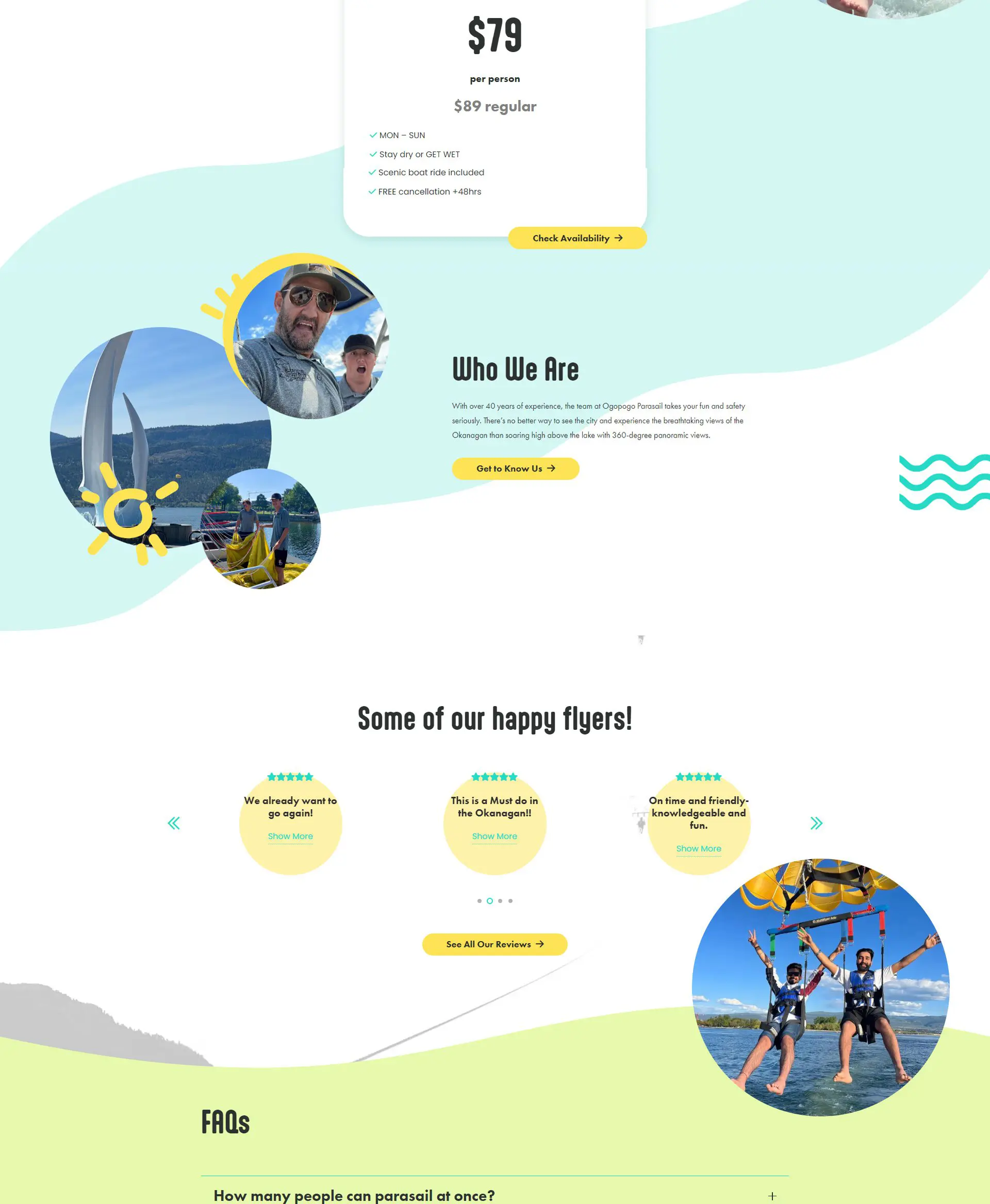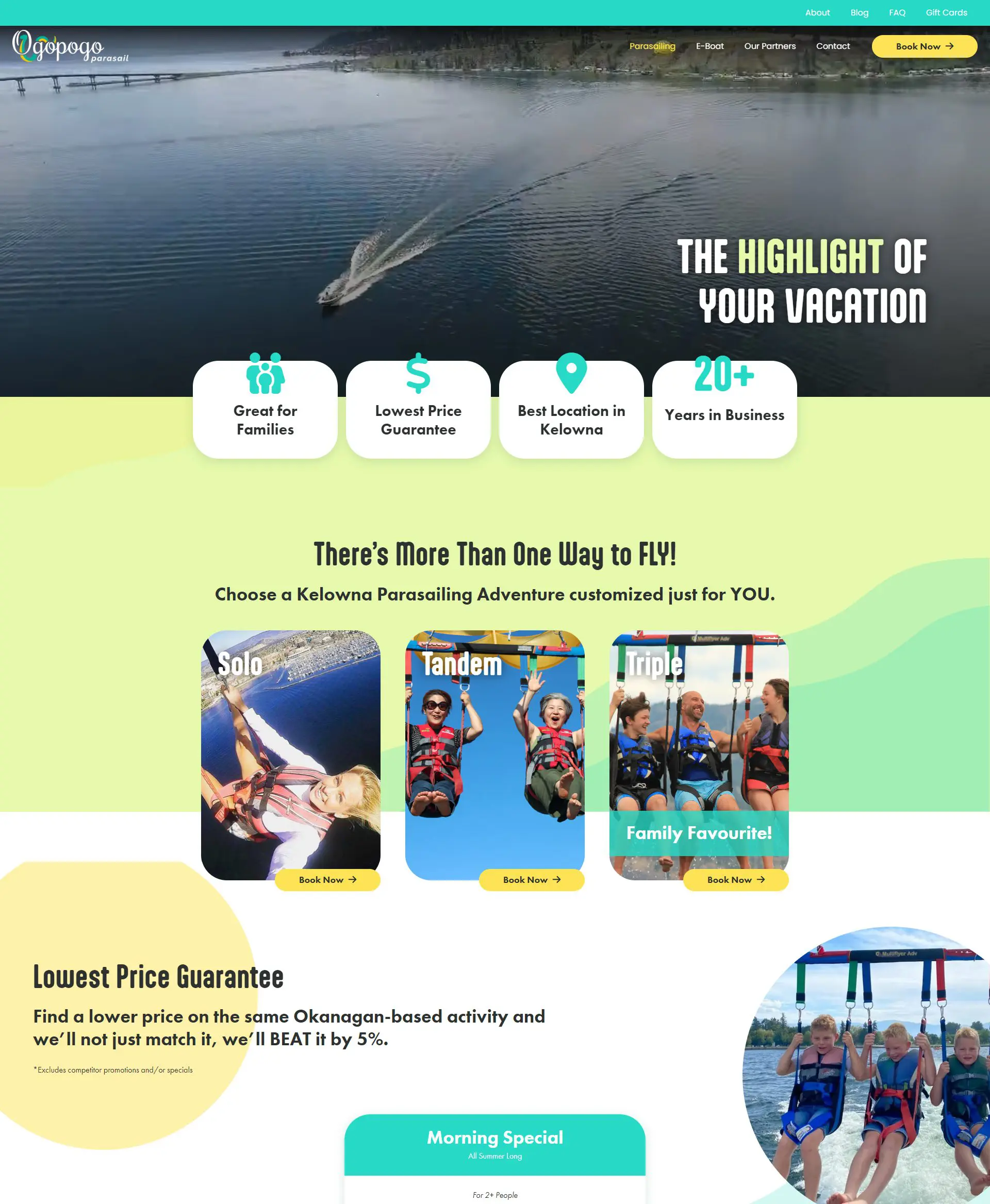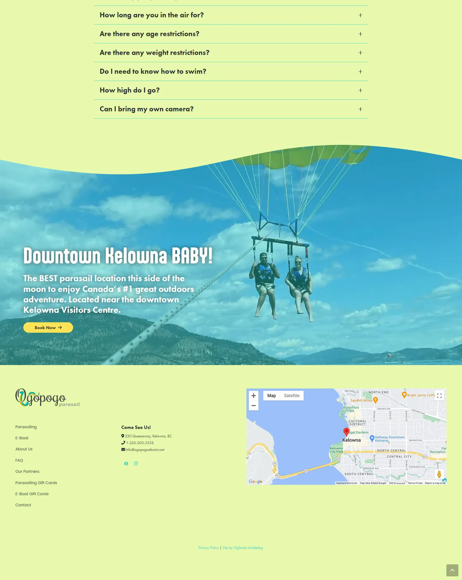 Ogopogo Parasailing & E-Boat approached Vigilante Marketing with the goal of revamping their website to better showcase their services, attract a wider audience, and create a more engaging user experience. They wanted a design that reflected the adventurous spirit of their activities while maintaining a lighthearted and family-friendly atmosphere. Additionally, they required the incorporation of testimonials to provide social proof and FAQs to address common visitor inquiries. Furthermore, they desired a seamless booking system that would keep users on the site throughout the reservation process.