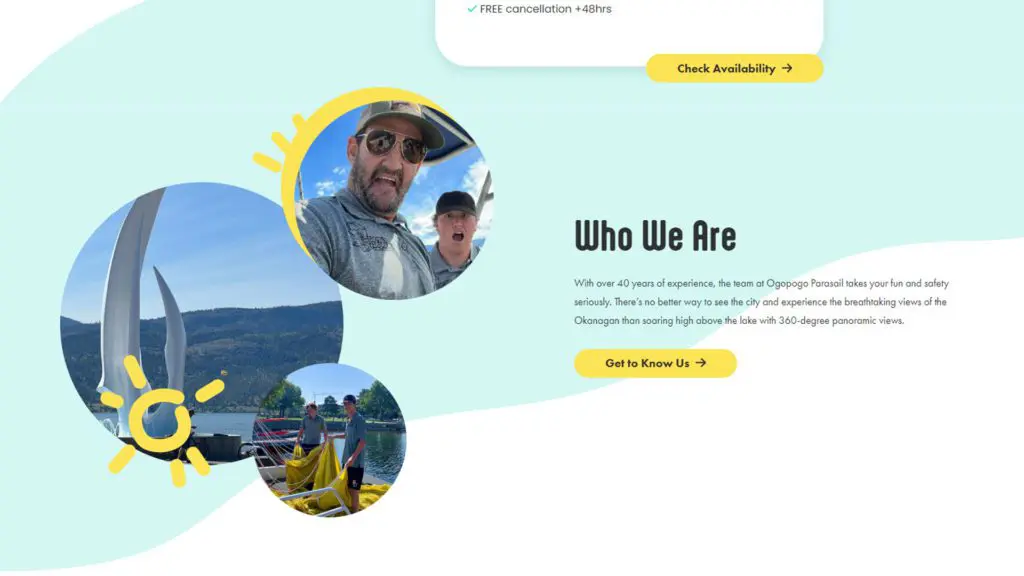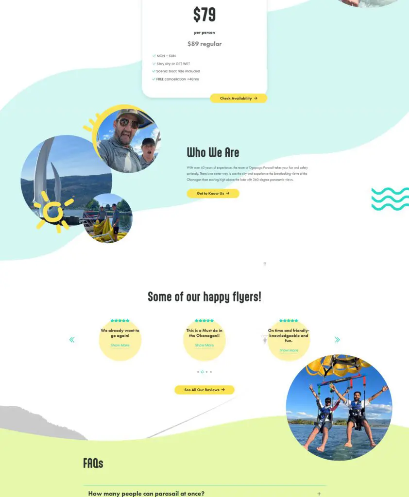 Tina maintained a familiar layout, ensuring key elements such as services and pricing were displayed prominently on the page. To enhance the website’s credibility and address visitor concerns, she integrated testimonials from satisfied customers. This social proof would help potential customers feel more confident in choosing Ogopogo Parasailing & E-Boat for their water sports activities. Furthermore, Tina added a section for frequently asked questions (FAQs) to provide clear information and alleviate any doubts that new visitors may have.