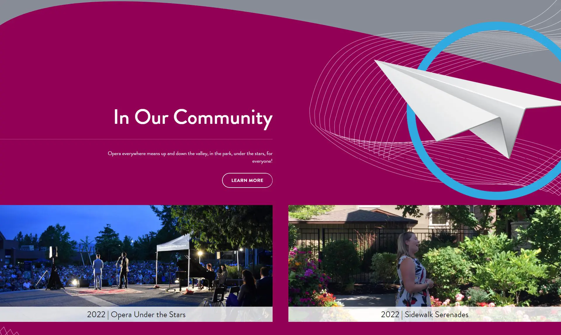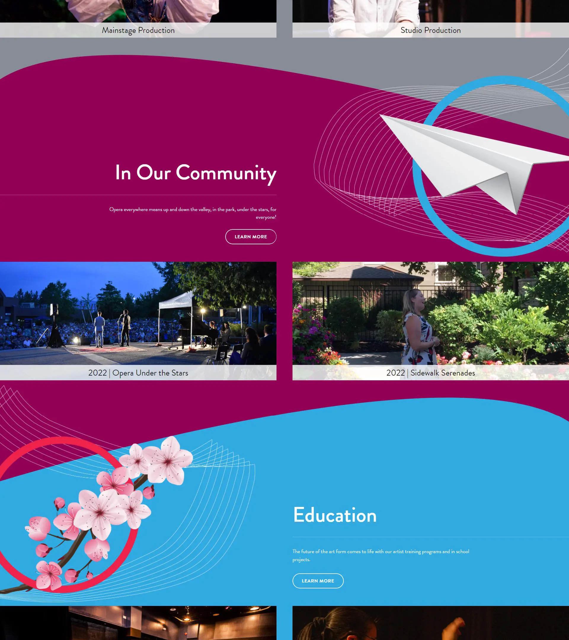 Lydia Avsec from Copilot Design created beautiful design elements for the VM designer, Tina Raposo, to utilize in her overall website redesign. From those elements, she made two homepage banners that could be swapped out to feature significant events or several upcoming events at a glance for visitors to easily see what they could attend. In the pillars section, she used curved separations to allude to the flowing organic nature of music and art. A music staff motif and semi-circle background shapes to match the O in the logo were used throughout the site. To lighten up the design, in comparison to their previous website, vibrant reds and whites were applied to create a brighter mood and help the pillars appear more vivid.