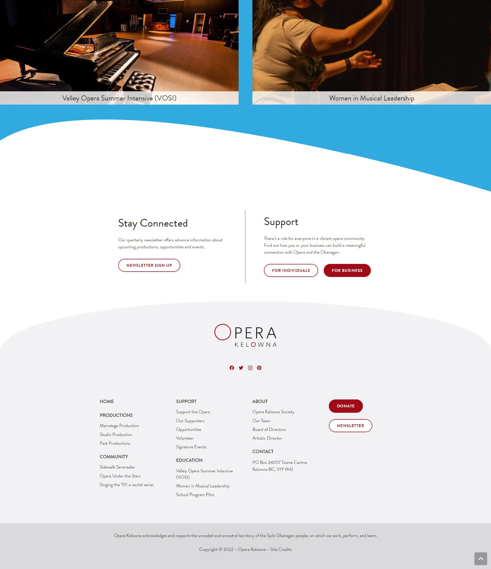Opera Kelowna is a registered, non-profit, charitable opera company delivering exceptional Canadian opera performances and engaging audiences across the Okanagan since 2013. A member of the Association for Opera in Canada (AOC), they are dedicated to bringing the power and passion of opera to their community.