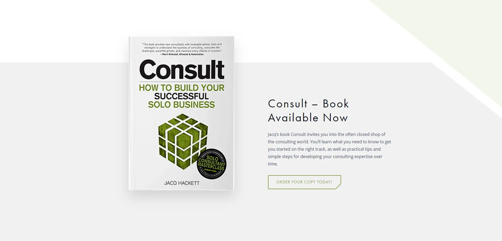 Pulling elements such as the green cube from Jacq’s consulting book, Tina created a modern, professional design that utilized muted earth tones and geometric motifs throughout each site page. All while keeping Jacq and her career accomplishments front and center. Ensuring users feel validated in purchasing courses or mentorship services from a trusted source.