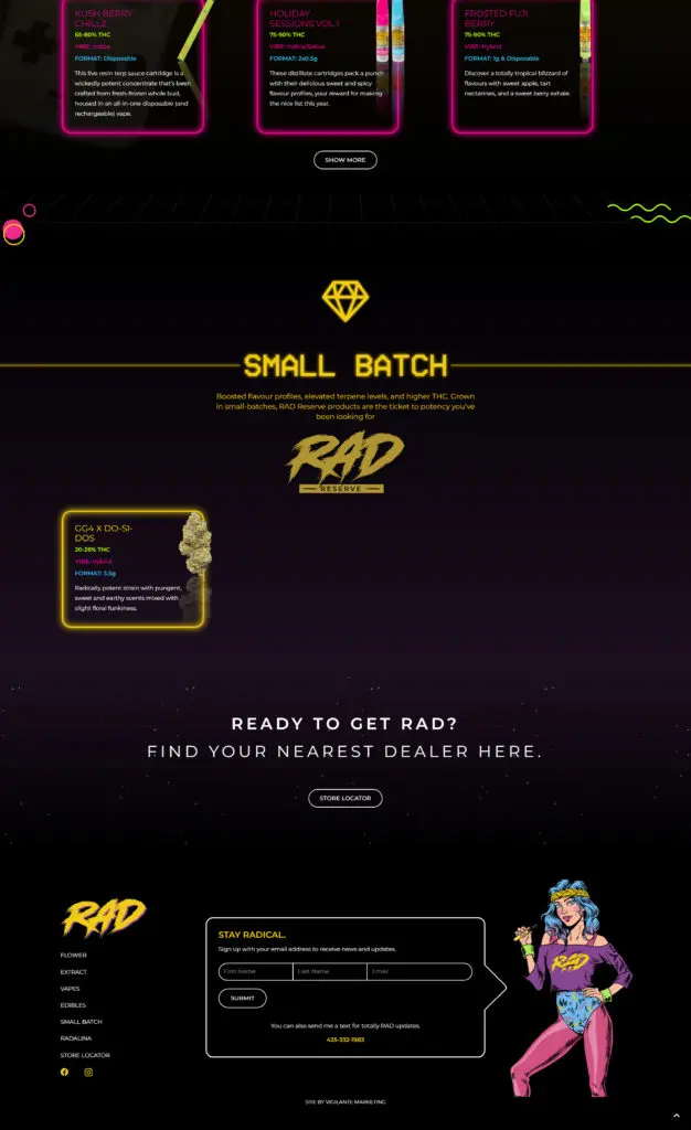 First, the VM design and development team sat down with RAD to discover and understand the direction they wanted their brand to take to best represent the 80s nostalgia feeling correctly. Next, our designer, Tina Raposo, researched popular design trends from the 1980s. She then used the information she gathered to produce a site design that contains bright, neon colors, 8-bit graphics, and textured backgrounds using faded 80s-themed objects such as cassette tapes and arcade games.