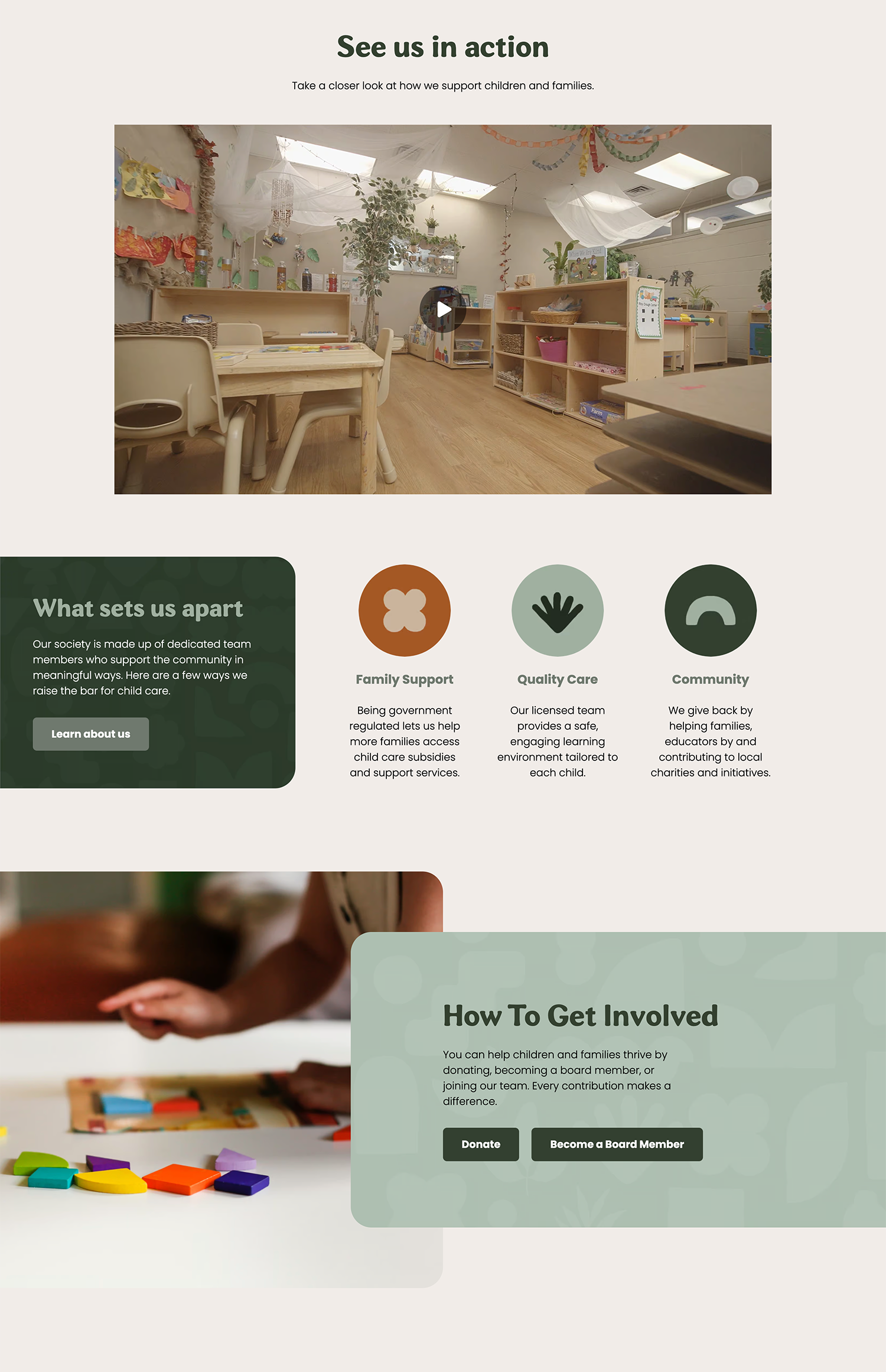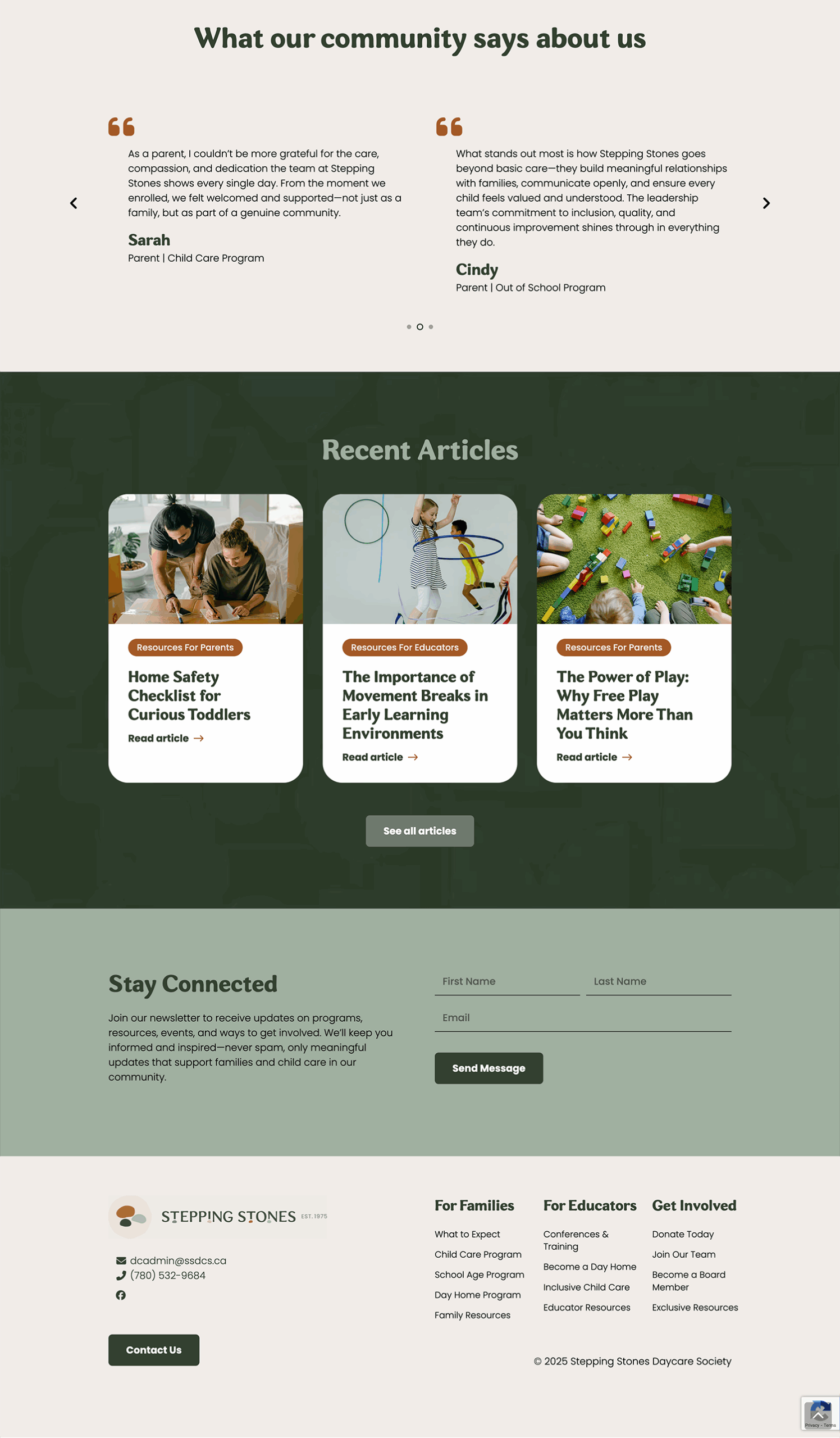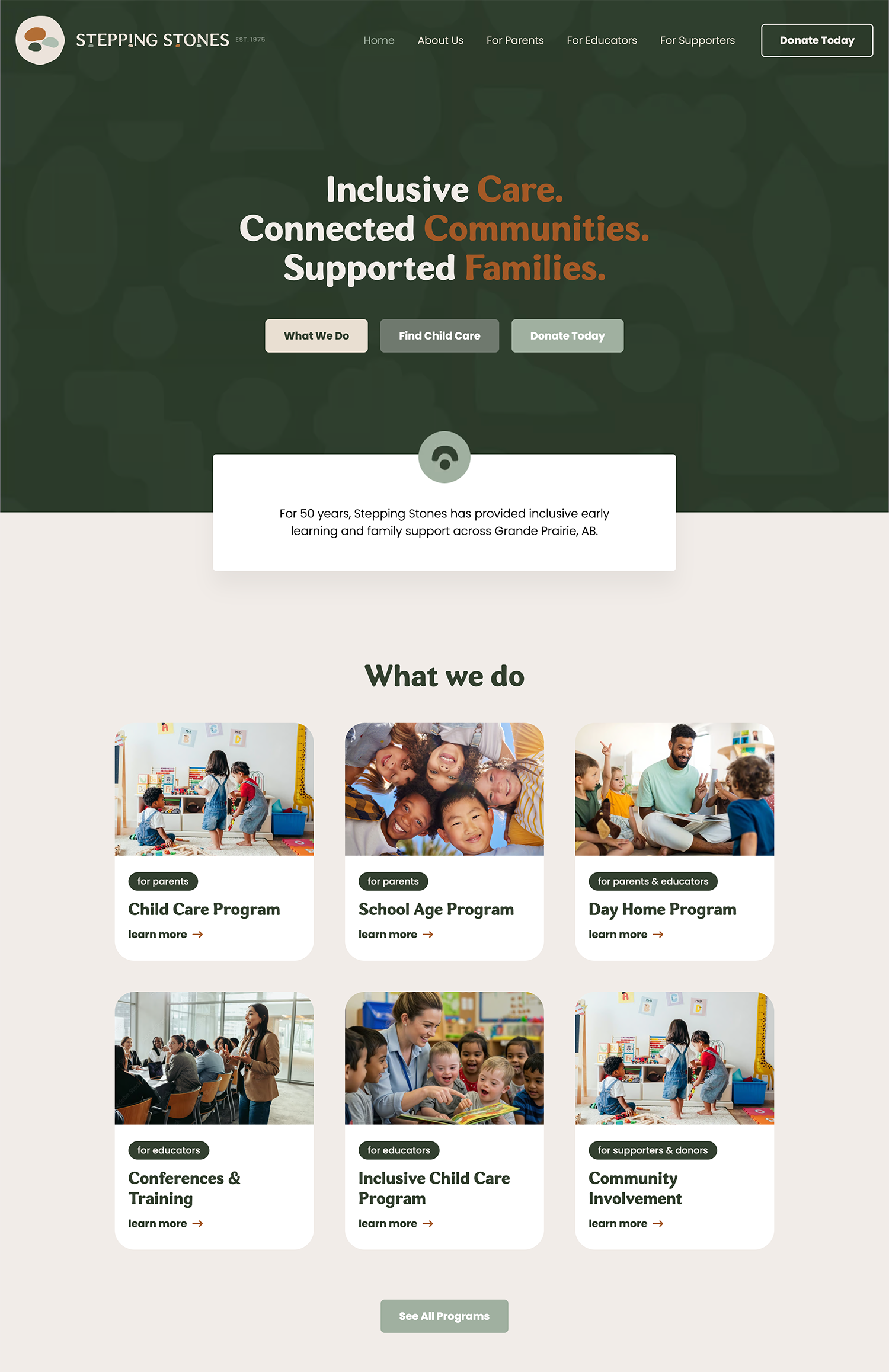 We delivered a thoughtful website overhaul that communicates Stepping Stones’ values of inclusion, community and excellence in early childcare. The new site clearly outlines their diverse programs—Child Care, School Age, Day Home and Support services—while highlighting their mission to provide “Inclusive Care. Connected Communities. Supported Families.” We organized content by audience (Families, Educators, Supporters) to simplify navigation and encourage action, such as applying for a day‑home, joining the team, or donating. High‑impact visuals and testimonials reinforce the sense of trust and warmth in their programs. The result is a multi‑functional digital platform built to serve families, educators and the wider community effectively.