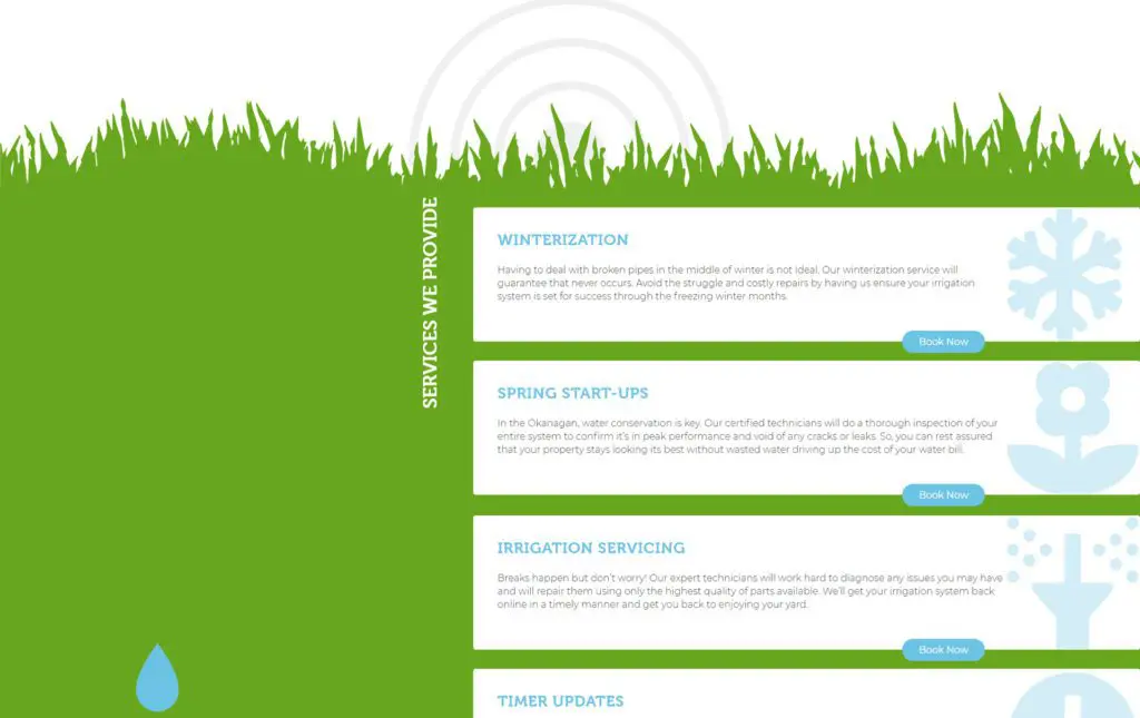 Next, Tina Raposo, Vigilante Marketing’s designer, worked with Rob to design a fresh and fun website. She utilized bright blues and greens to create a theme that accentuated the irrigation services. She also brought movement to the pages by adding a raindrop in motion feature with ripple effects as the drops landed.
