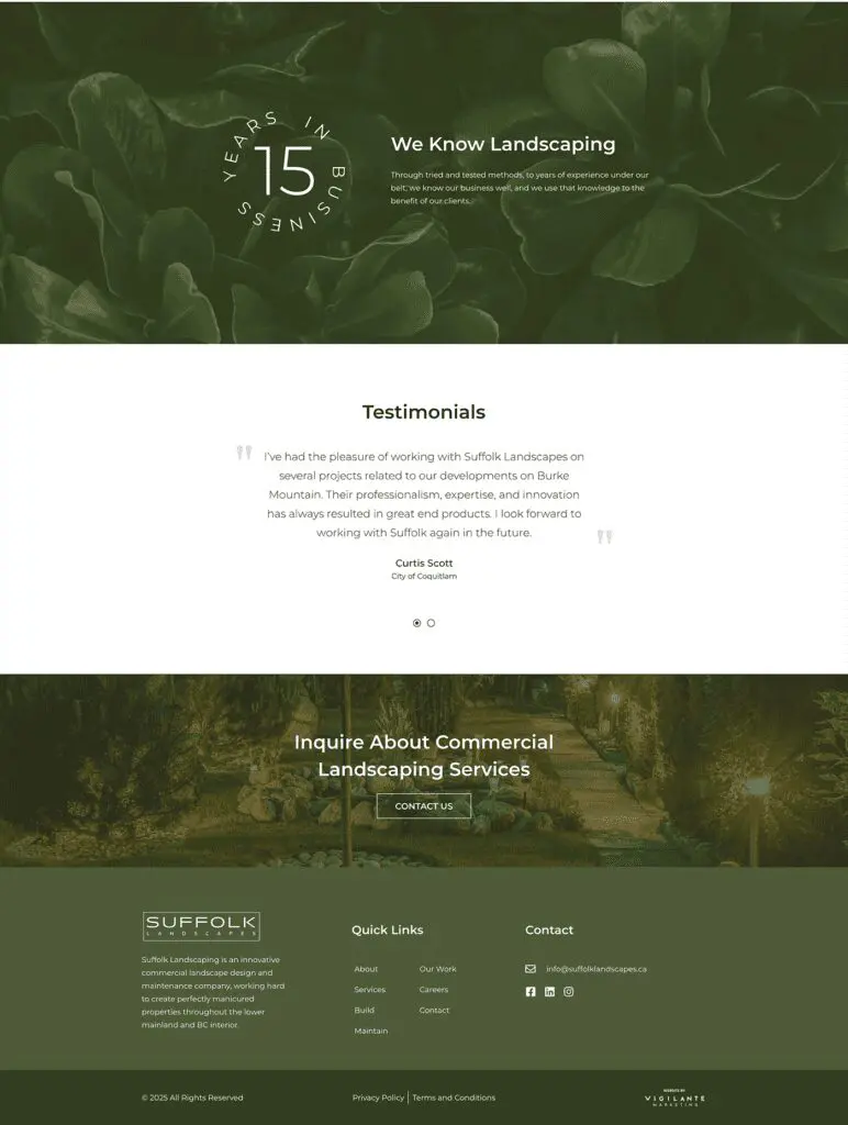 We developed a unique brand identity and website for Suffolk Landscapes that reflects their dedication to innovation and high-quality service. The website features detailed information on their landscaping services, including design, construction, and maintenance, highlighted through engaging visuals and compelling content. We ensured the site was user-friendly and informative, allowing visitors to easily explore Suffolk Landscapes’ extensive portfolio and service offerings, enhancing their online presence and client engagement.
