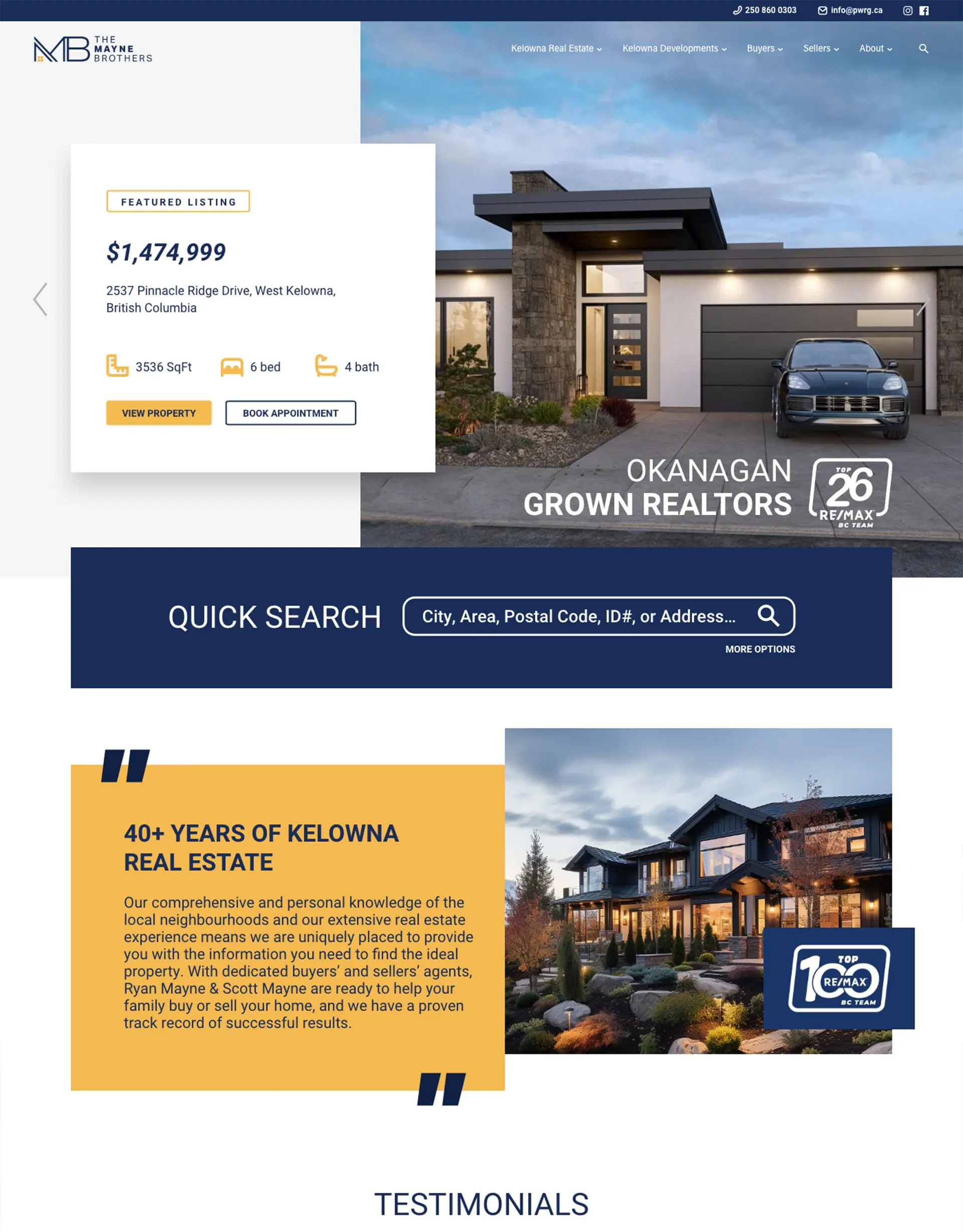 For The Mayne Brothers, we developed an elegant and intuitive website that reflects their stature in the real estate industry. The website is designed with a sleek, modern aesthetic that matches the upscale nature of their business, appealing to sophisticated clients and investors. It includes comprehensive sections on their services, a portfolio page displaying detailed accounts of past and current projects, and a contact interface that provides clear paths for engagement. Additionally, we incorporated testimonials and case studies to demonstrate their track record of success and client satisfaction. This streamlined website not only bolsters The Mayne Brothers’ online visibility but also strengthens their brand as industry leaders, making it a powerful tool for business growth and client engagement.