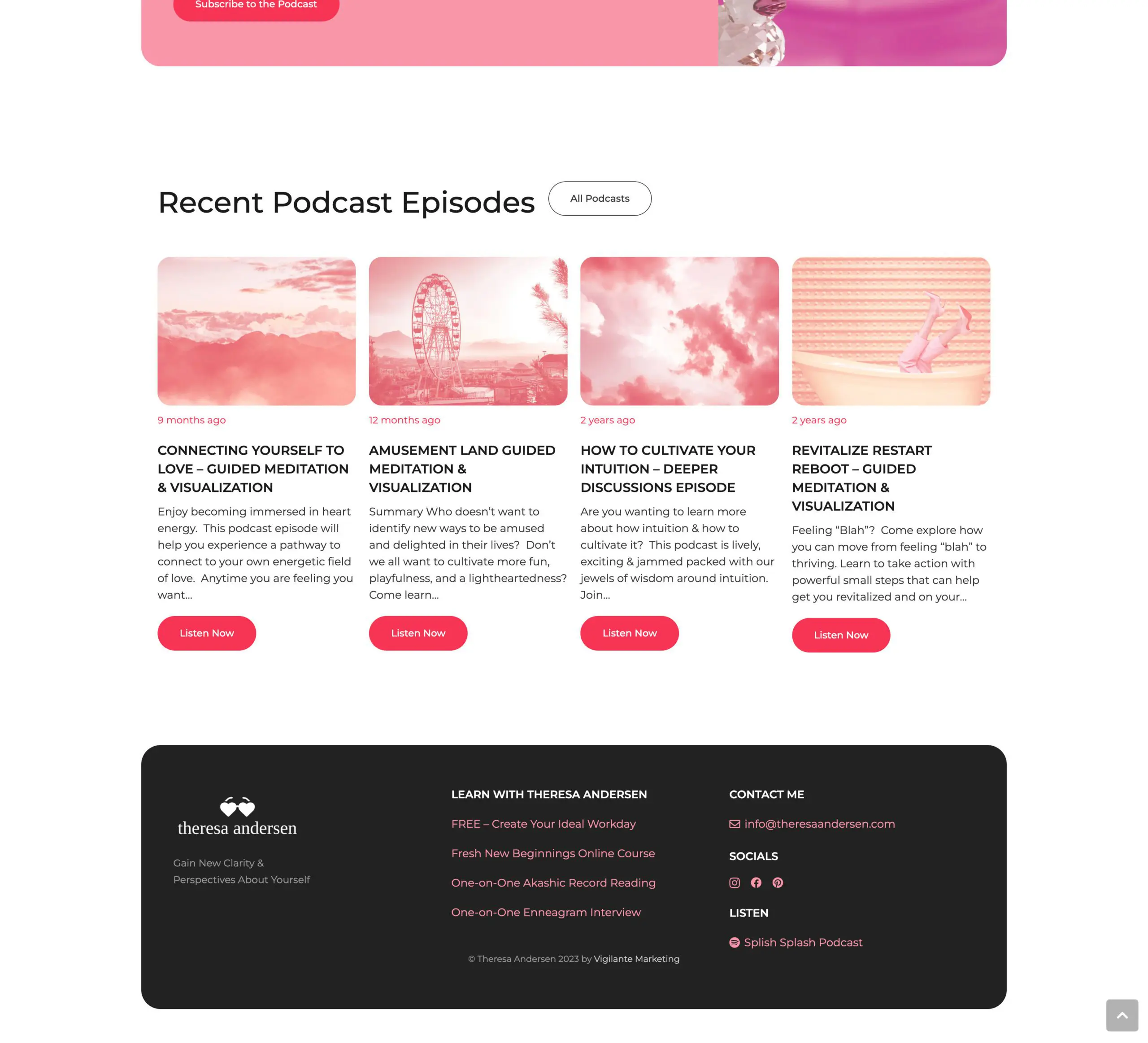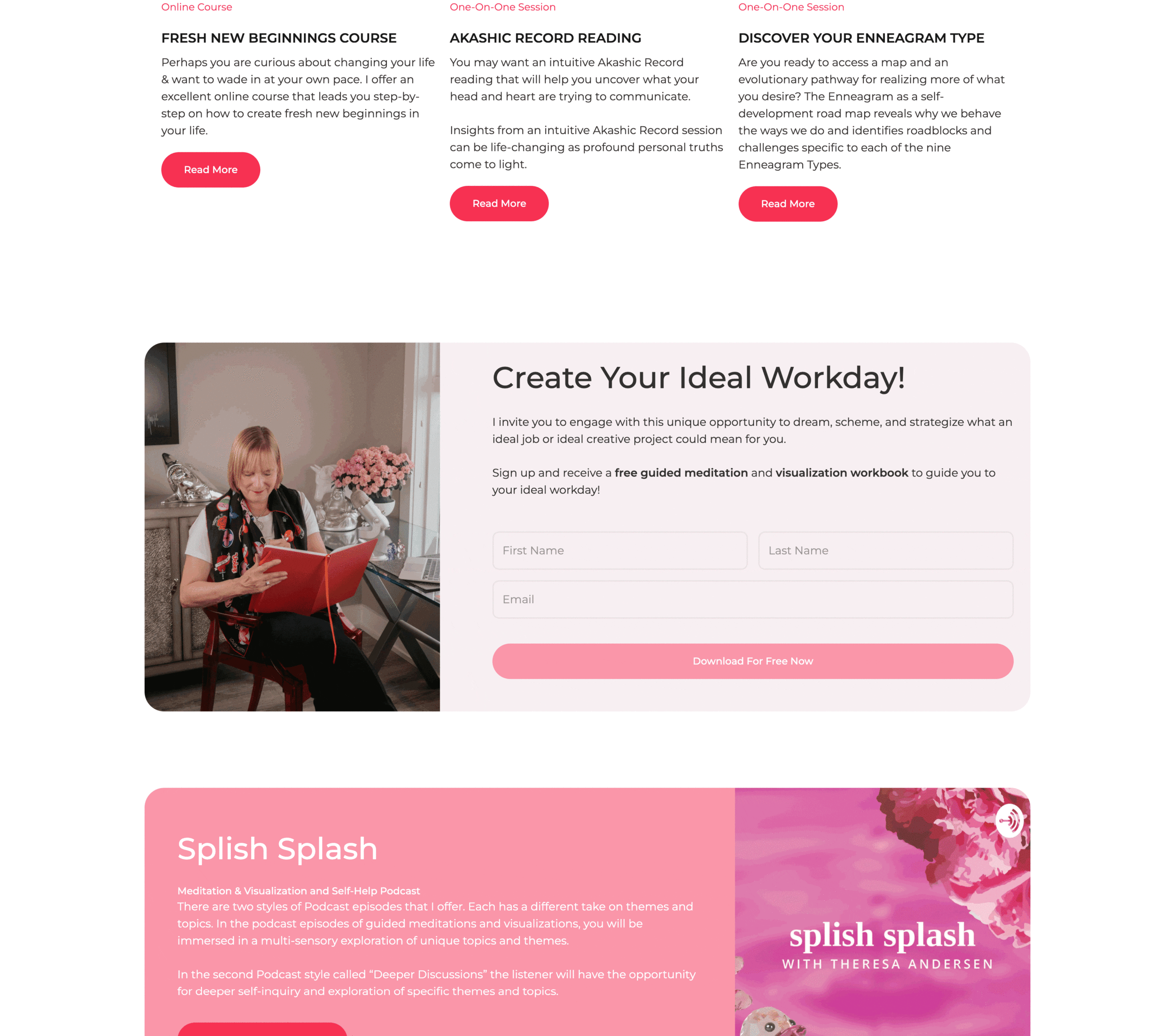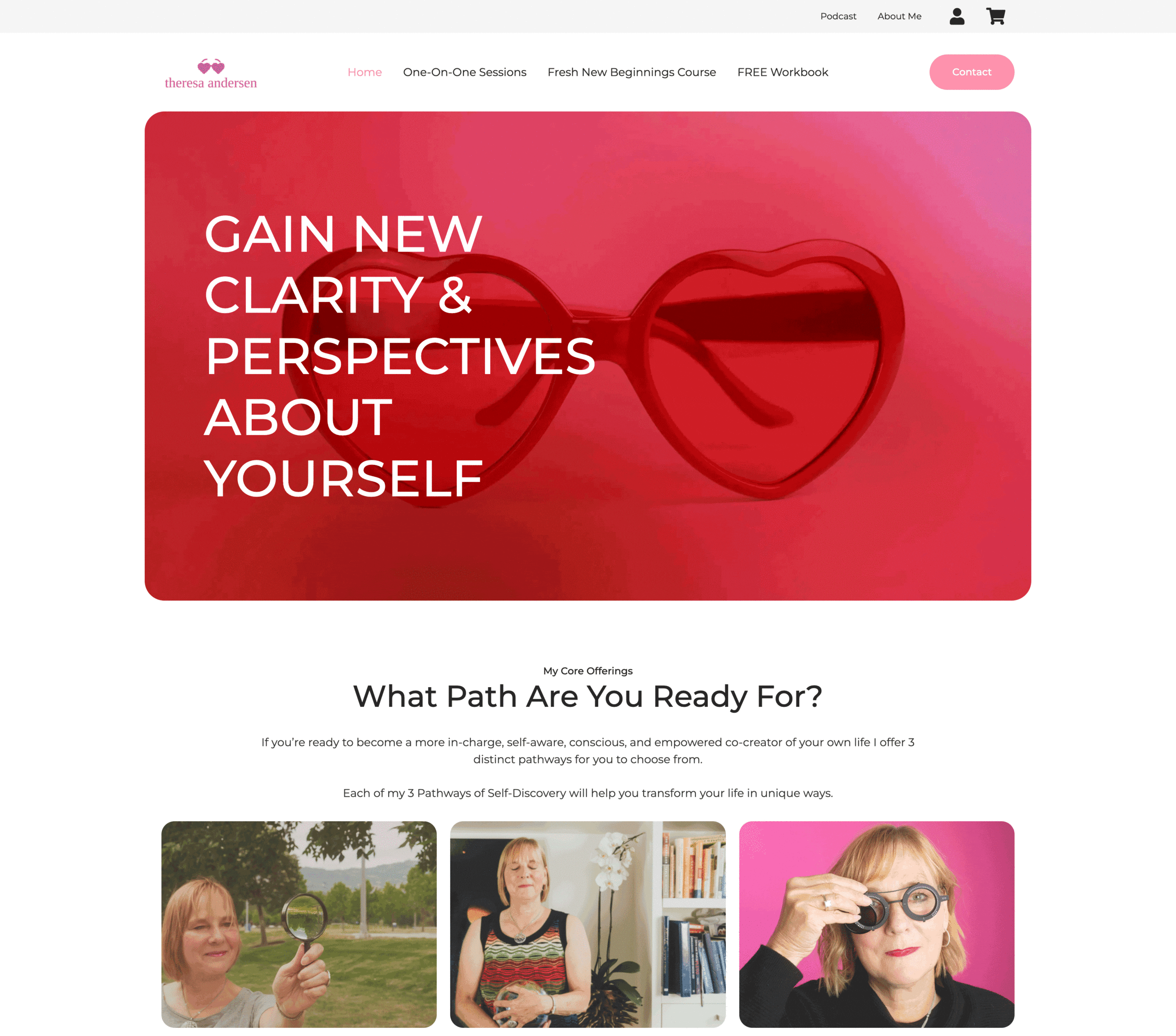 We optimized the layout of the site and imported existing content to help enhance user navigation and increase conversion rates. With its new clean, and intuitive design, users can now easily browse Theresa’s services, book sessions, listen to her podcast, or enroll in her online course. This streamlined approach, with Theresa’s enriched content and our strategic design and build, has effectively turned the website into a powerful marketing and engagement tool that fully aligns with Theresa’s business objectives.