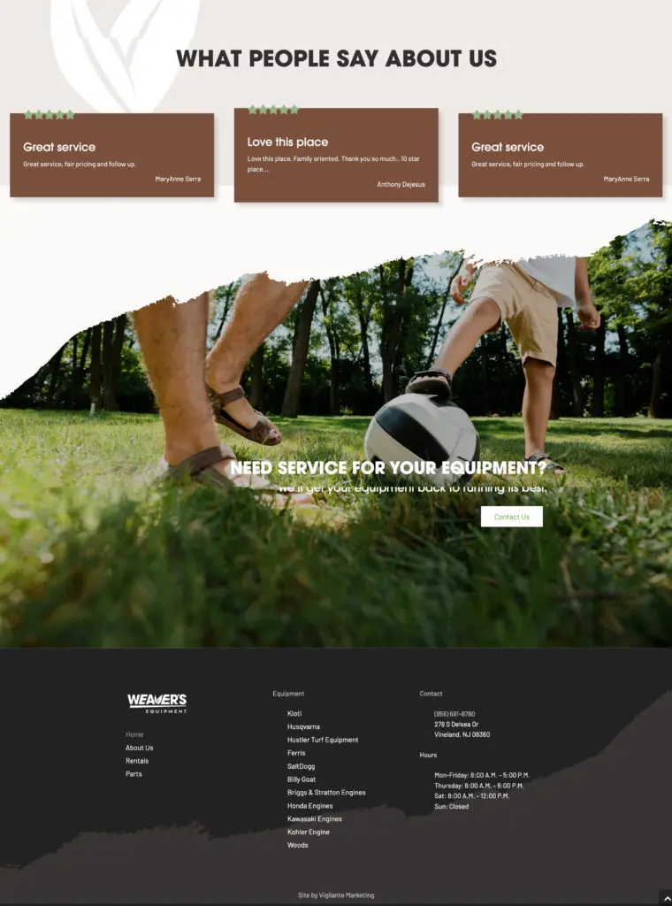 They added a significant amount of content to the website, including 12 brands, 30 categories, and 180 products, with more to be added. They also created custom templates for the product, brand, and equipment grid pages. To showcase customer satisfaction, they imported testimonials from Google reviews. In summary, Tina and Ben worked together to design and develop a visually appealing and user-friendly website that effectively represents Weaver Equipment and its offerings while leveraging Tina’s logo design with great attention to detail and an understanding of design principles.
